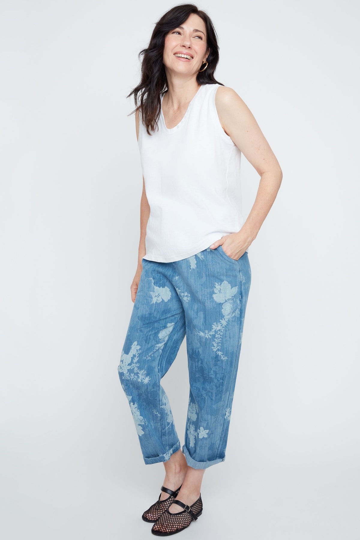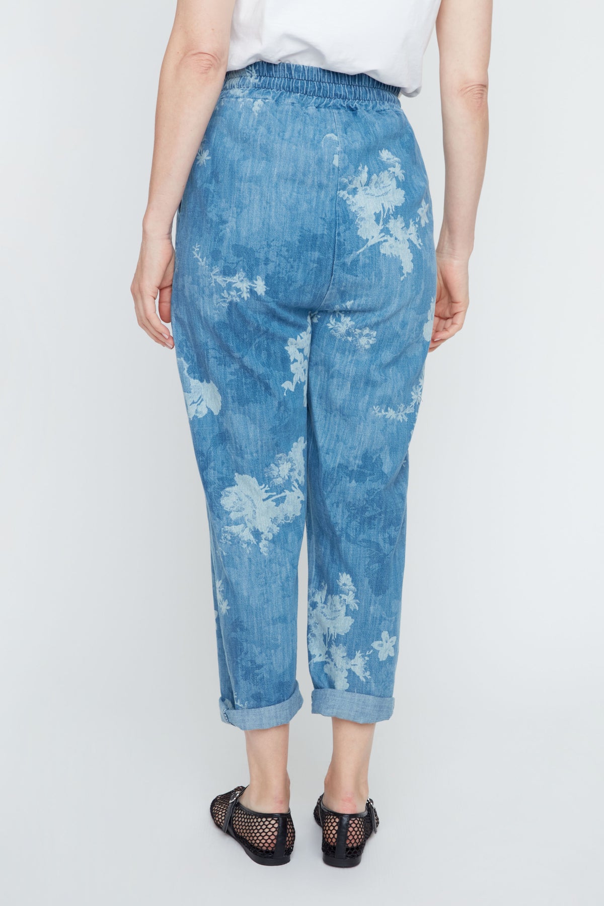 Elastic Waist Floral Printed Lightweight Denim Pants – Blue