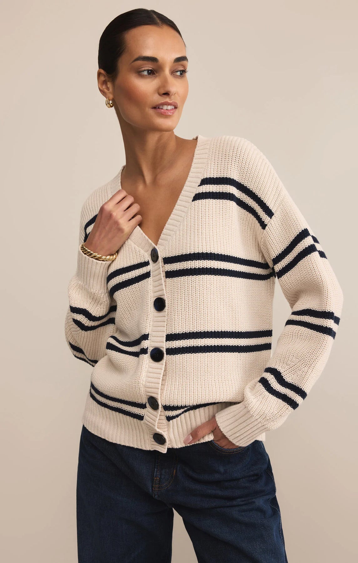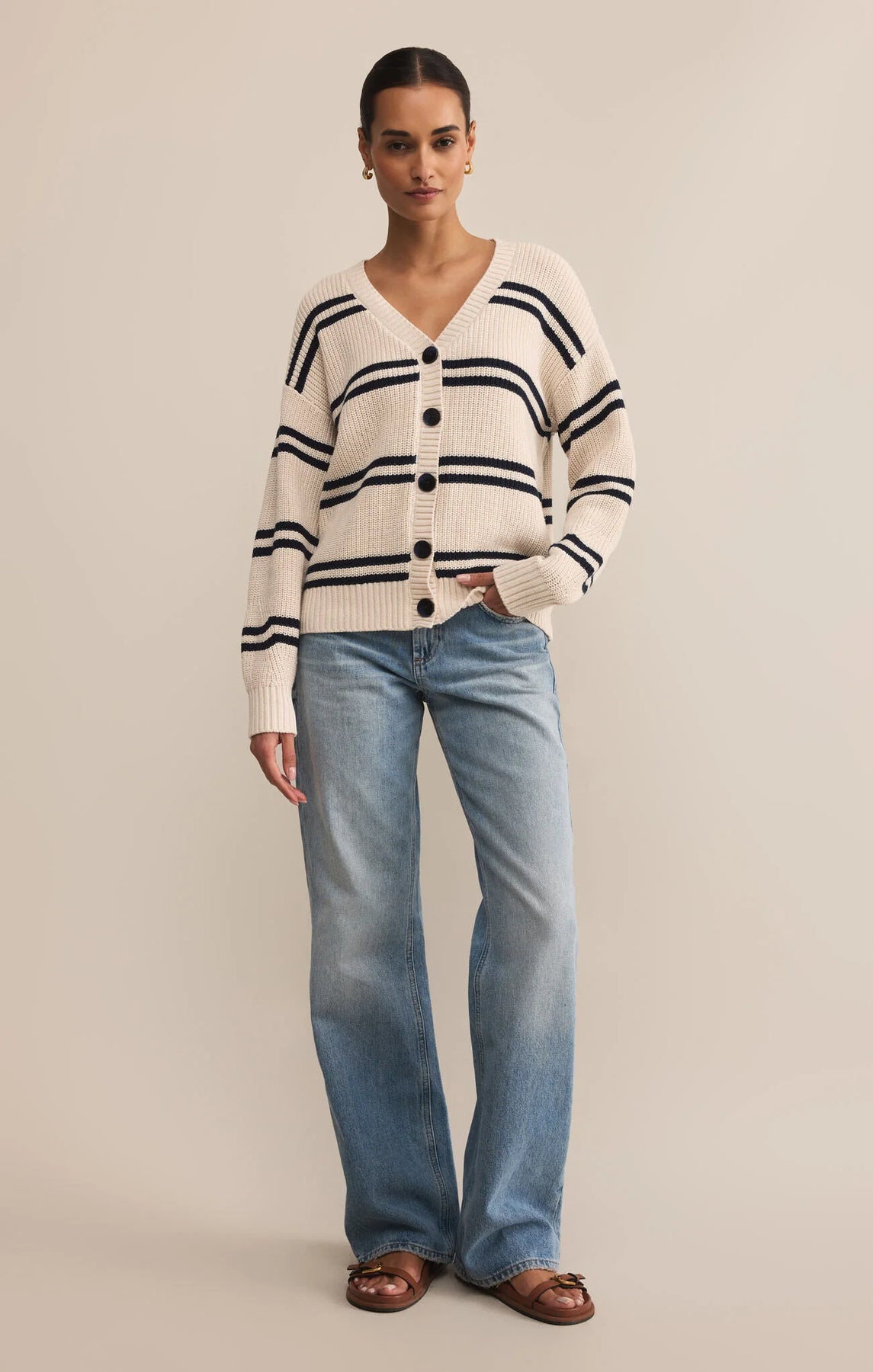 Add a playful twist to your everyday look with the Boyfriend Striped Cardigan in Crystal. Its cozy oversized fit and charming V-neck make layering a breeze, while the bold stripes and contrasting buttons bring fun and flair. Perfect for lounging or stepping out, this cardigan turns casual into effortlessly cool with a wink.