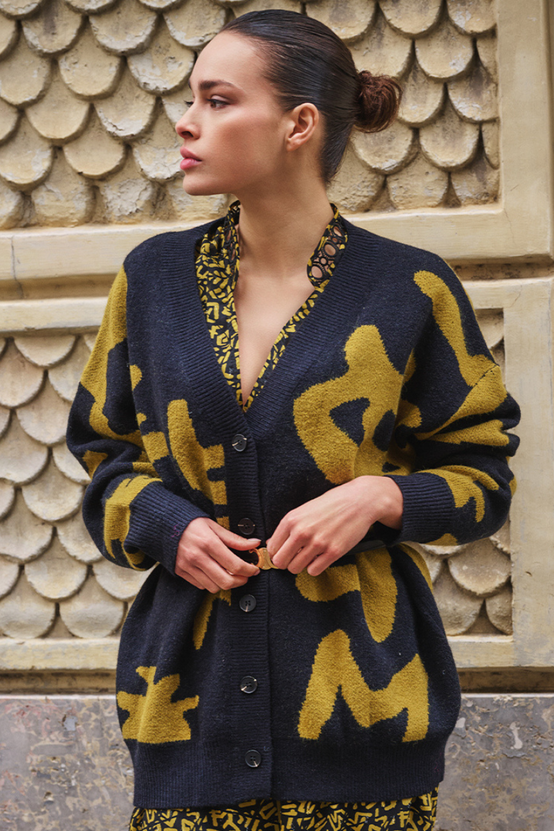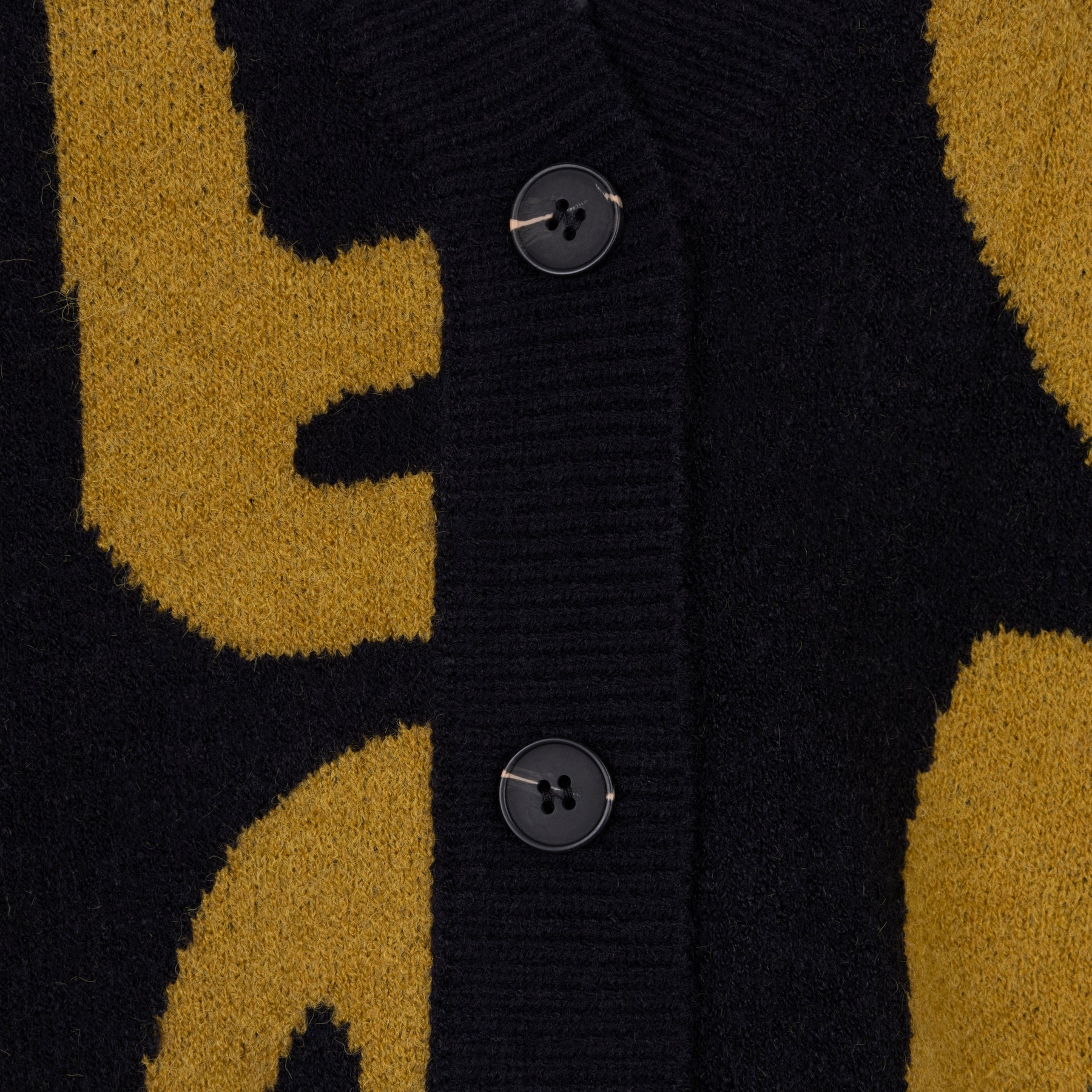 Add a pop of character to your wardrobe with the Intarsia Letters Cardigan in Black. This cozy cardigan is made for those who love to express themselves through style. The intarsia letter design across the front adds a playful, graphic element, while the soft knit fabric ensures all-day comfort and warmth.