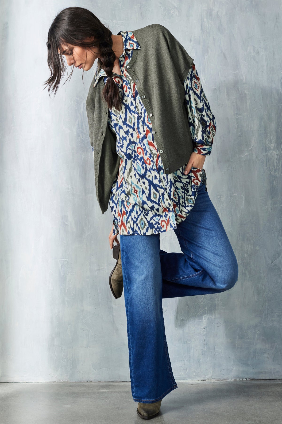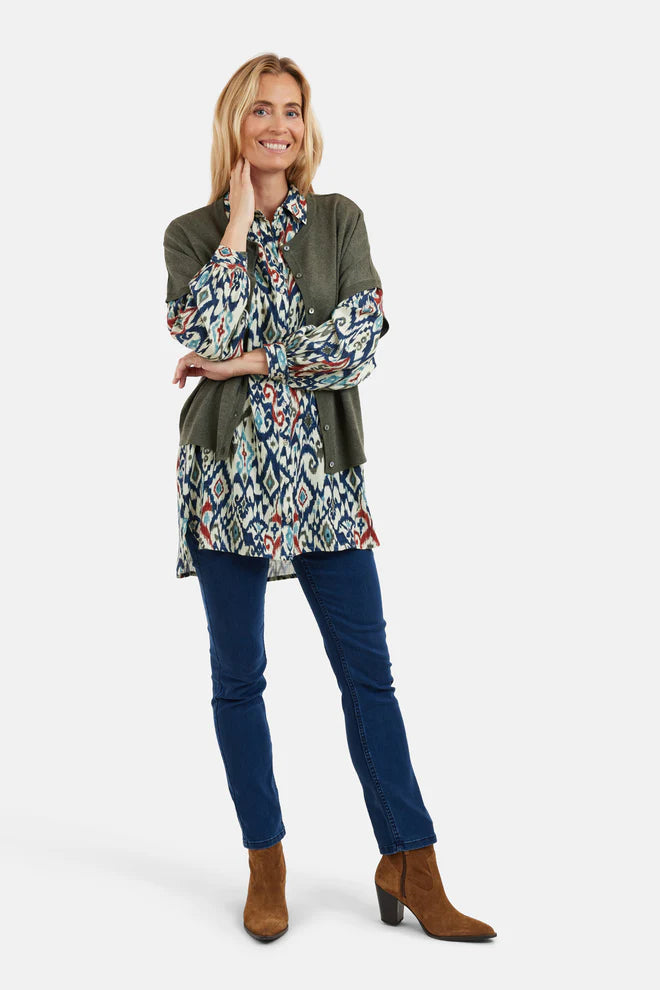 The simple cut makes it ideal for layering over patterned blouses and shirts. Use it as a light and feminine alternative to a vest or light jacket.