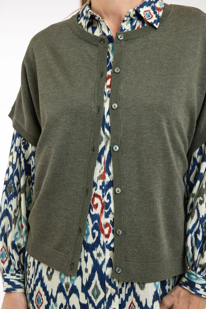 This short-sleeved cardigan from in army green is a stylish and versatile addition to your wardrobe. It features a round neckline, button closure at the front and is knitted in a soft viscose and polyester blend that feels light and comfortable against the skin. The model has a relaxed fit and short sleeves with fine ribbed edges.