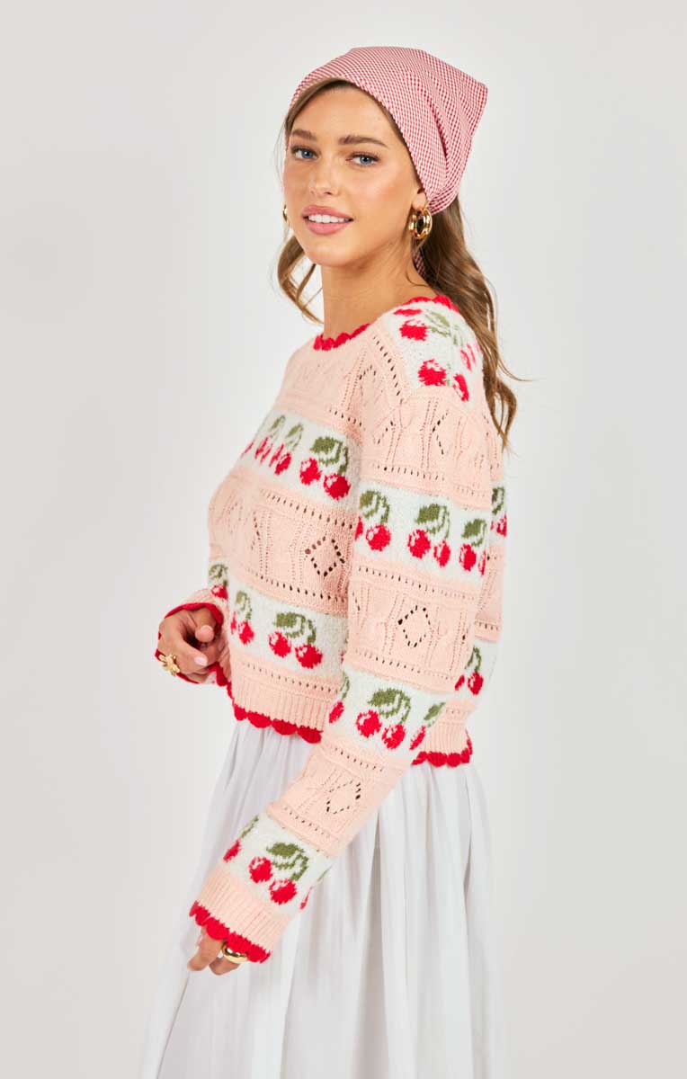 Sweet and slightly cheeky, this cherry sweater is pure joy in knit form. Featuring a soft pointelle pattern, playful cherry jacquard bands, and scalloped edges, it’s the kind of piece that instantly makes an outfit feel more fun.
