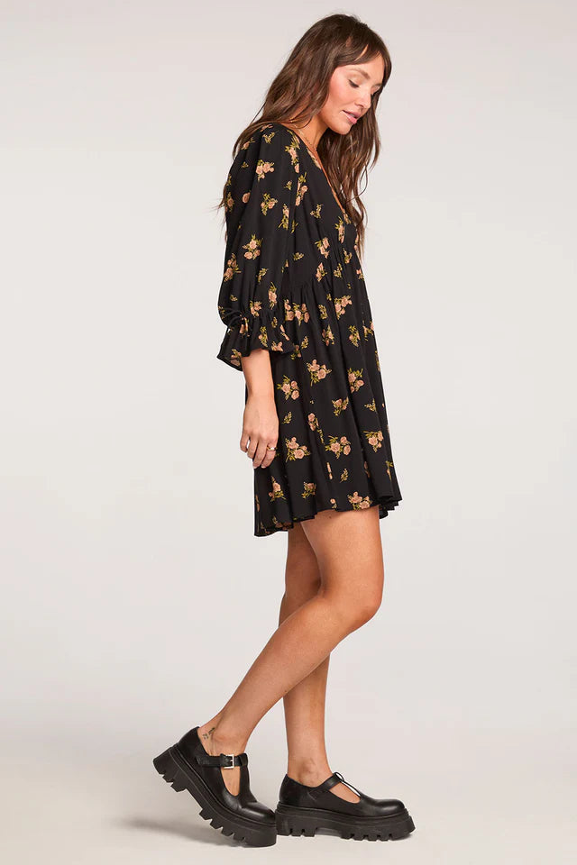 Slip into effortless style with the Marris Mini Dress, where comfort meets chic sophistication. This beauty showcases a moody botanical print against a sleek black backdrop, paired with a relaxed fit that lets you move freely. The charming scoop neckline and three-quarter sleeves topped with delicate ruffle cuffs bring just the right touch of whimsy, while the flowing skirt creates a graceful, flattering drape. Perfect for those days when you want to look polished without trying too hard.