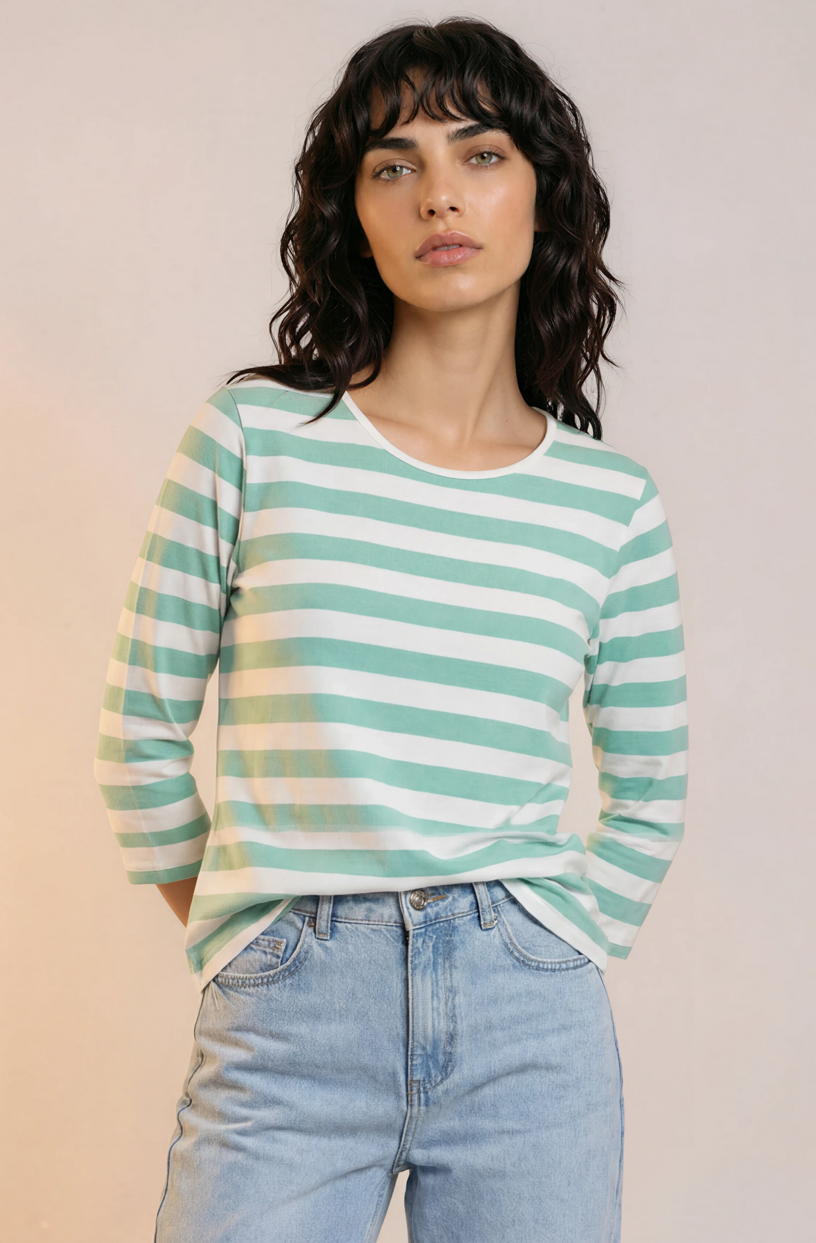 Stripes never go out of style—especially when they're this charming! This 3/4 sleeve top pairs crisp green and white stripes for a fresh, versatile look that works from casual coffee dates to weekend adventures. The three-quarter sleeves hit just right for layering or showing off on their own. Whether you're dressing it up with tailored trousers or keeping it relaxed with your favorite jeans, this striped essential brings effortless style to any wardrobe.
