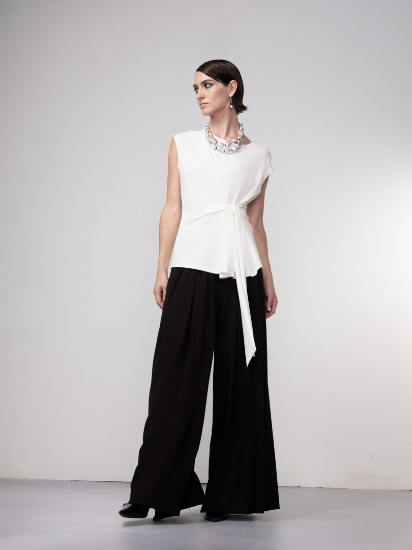 Woman wearing a white sleeveless top and black wide-leg pants on a plain background