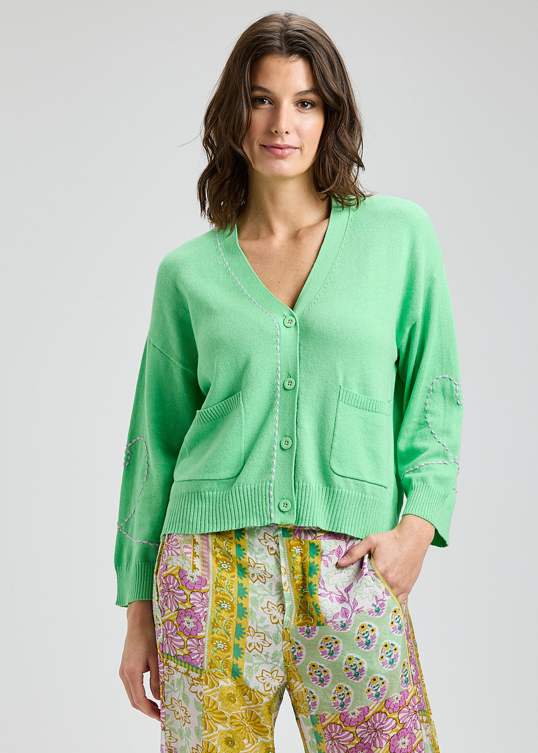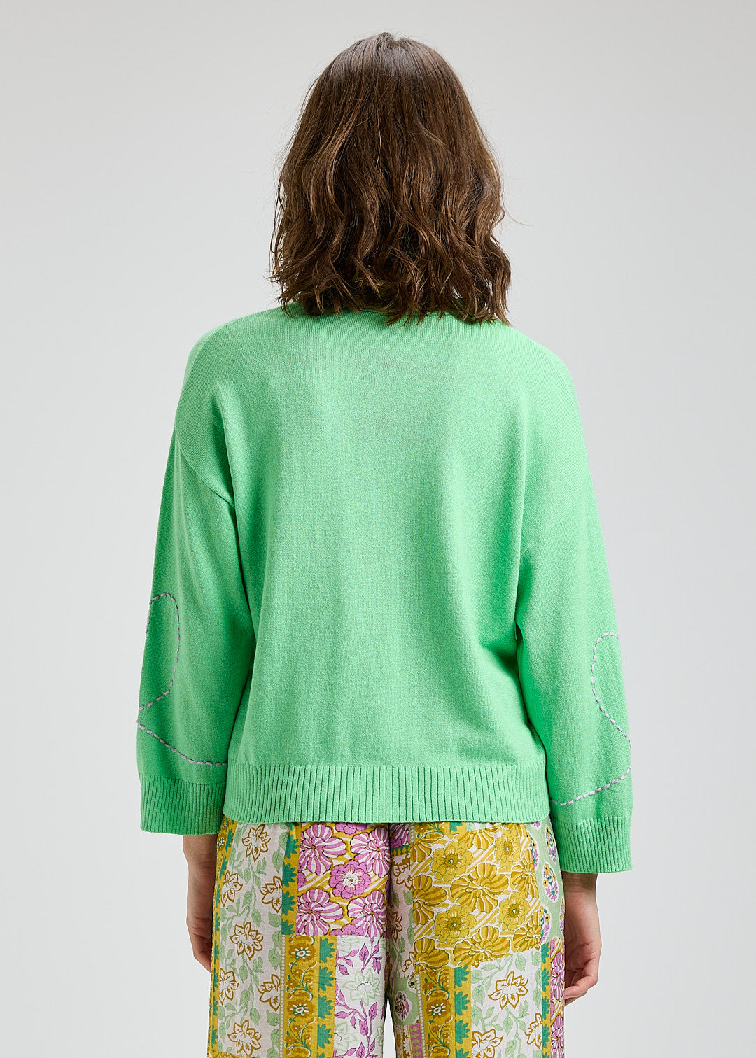Wrap yourself in cozy charm with this delightful apple green cardigan, featuring whimsical heart details that celebrate your softer side. The generous wide sleeves offer effortless comfort and a relaxed, modern silhouette perfect for layering over your favorite tees or dresses. Whether you're heading out for coffee or settling in for a quiet afternoon, this playful piece brings warmth and personality to any outfit. A wardrobe essential that proves comfort and style go hand in hand.