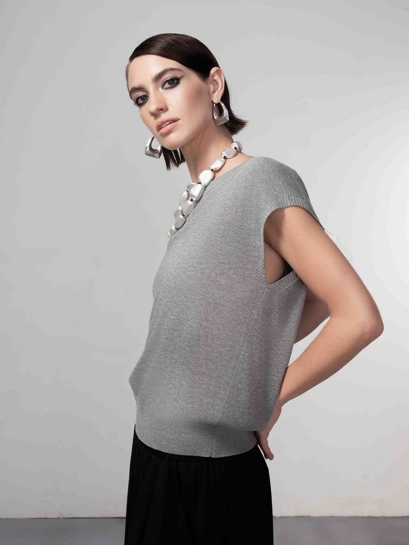 Effortless elegance meets cozy comfort in this silver short-sleeve sweater. The chic back crossover detail adds a flirty twist that's perfect for layering or wearing solo. Soft, breathable fabric keeps you cool while the flattering silhouette works for casual coffee dates, weddings  or weekend adventures. A versatile wardrobe essential that transitions seamlessly from season to season.