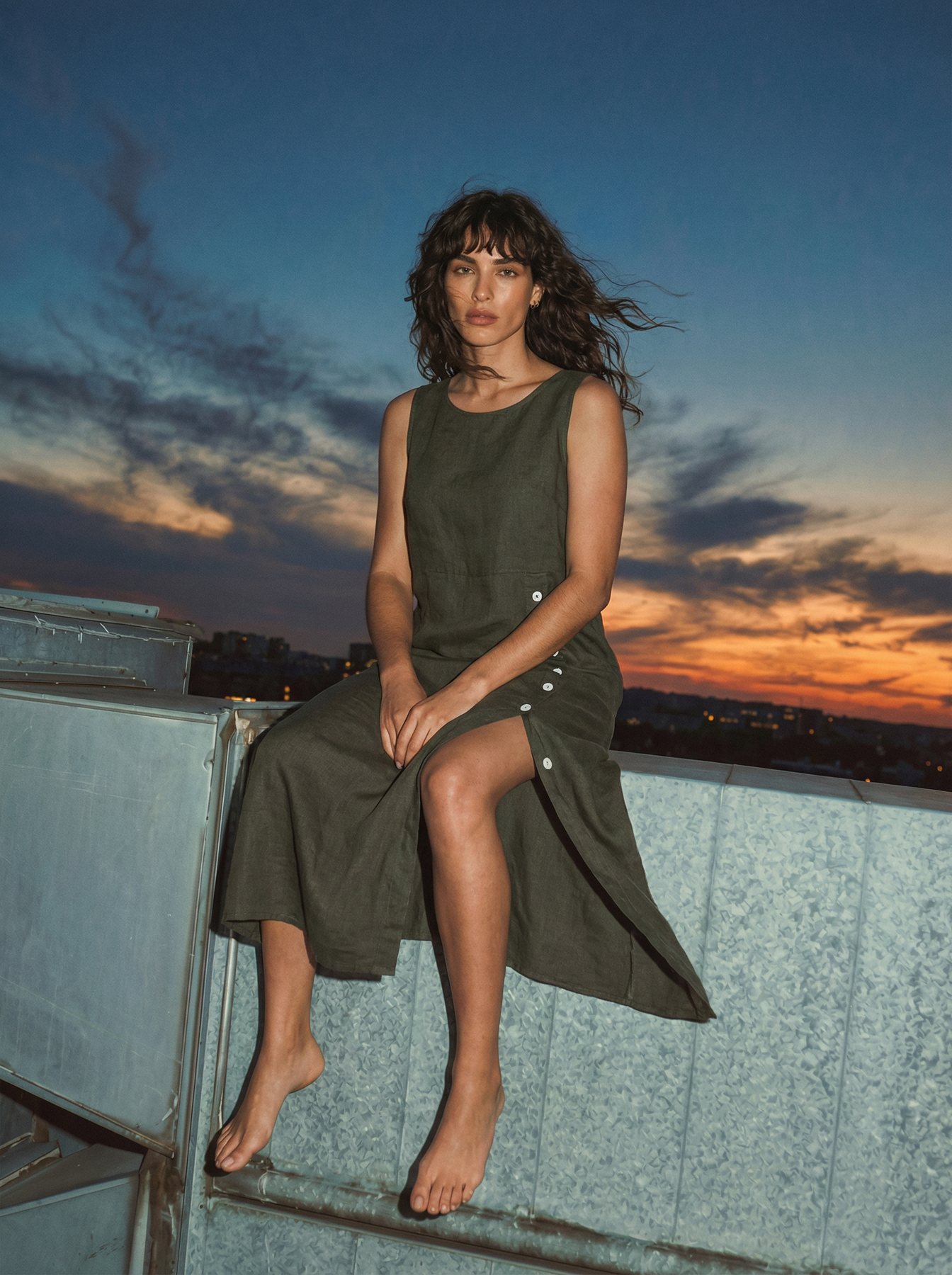 Effortlessly refined, this sleeveless linen dress features a clean, modern silhouette with a subtle straight-cut structure that flatters without feeling restrictive. Thoughtful side button detailing adds understated interest, while the side slit brings ease of movement and a touch of contemporary edge.