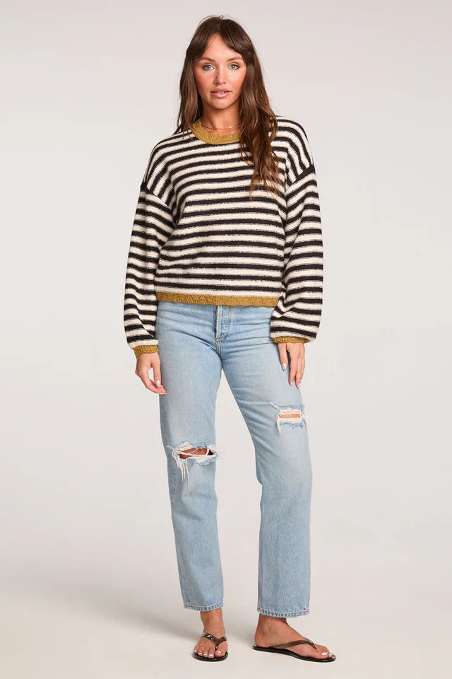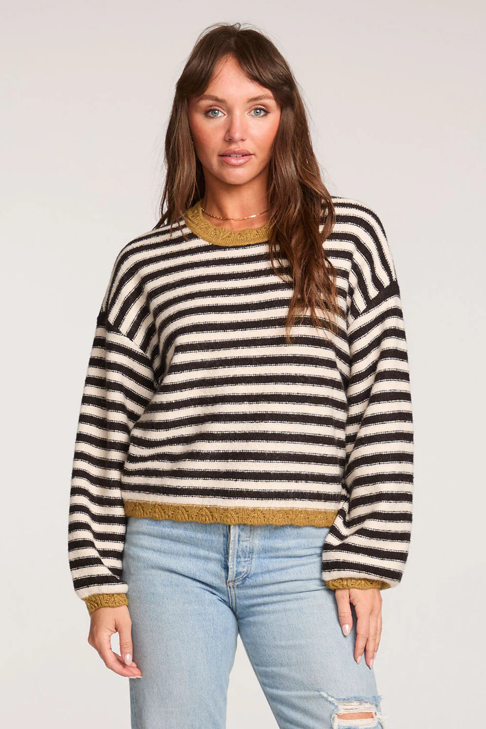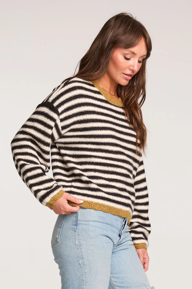 Elevate your sweater game with the Steevie—a chic black and white striped knit that's anything but basic. The high neckline and statement gigot sleeves bring drama and personality, while the cropped silhouette keeps things modern and flattering. Brown accents at the neckline, hem, and cuffs add a sophisticated twist that makes this piece feel both timeless and unexpectedly fun. Perfect for layering or wearing solo, it's the kind of sweater that makes getting dressed feel effortless.