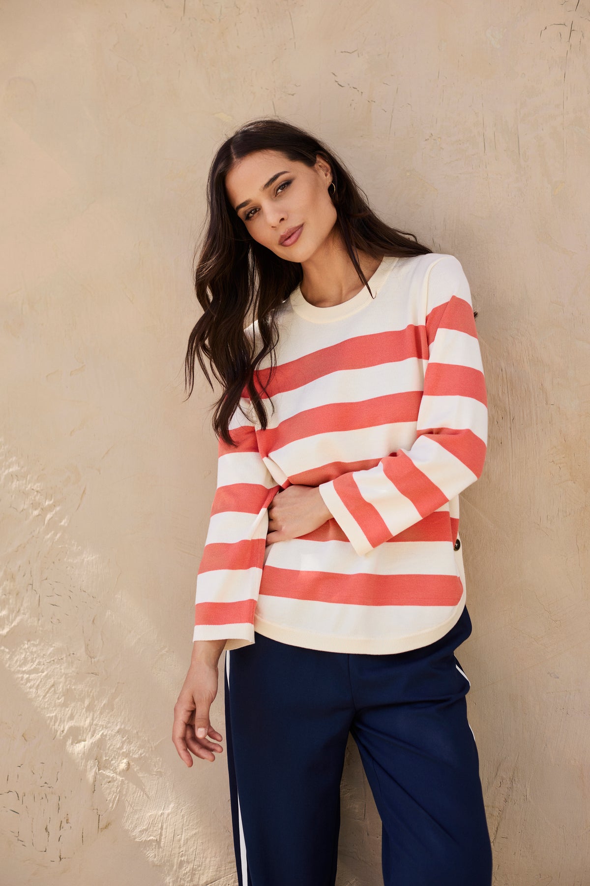 Striped Sweater with Side Buttons - Orange/Cream