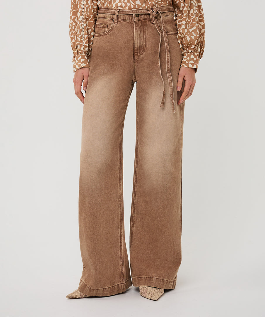 Wide Leg Denim Jeans with Tie Belt - Cappuccino