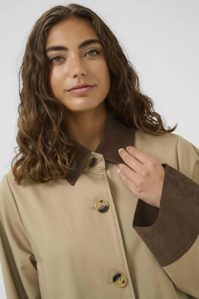 The Sasha Trenchcoat in Dune combines timeless style with practical details. Featuring a classic button-up front and rich brown corduroy trim that adds texture and visual interest, this piece layers effortlessly over any outfit. Perfect for transitional seasons, it delivers polished sophistication with everyday wearability.