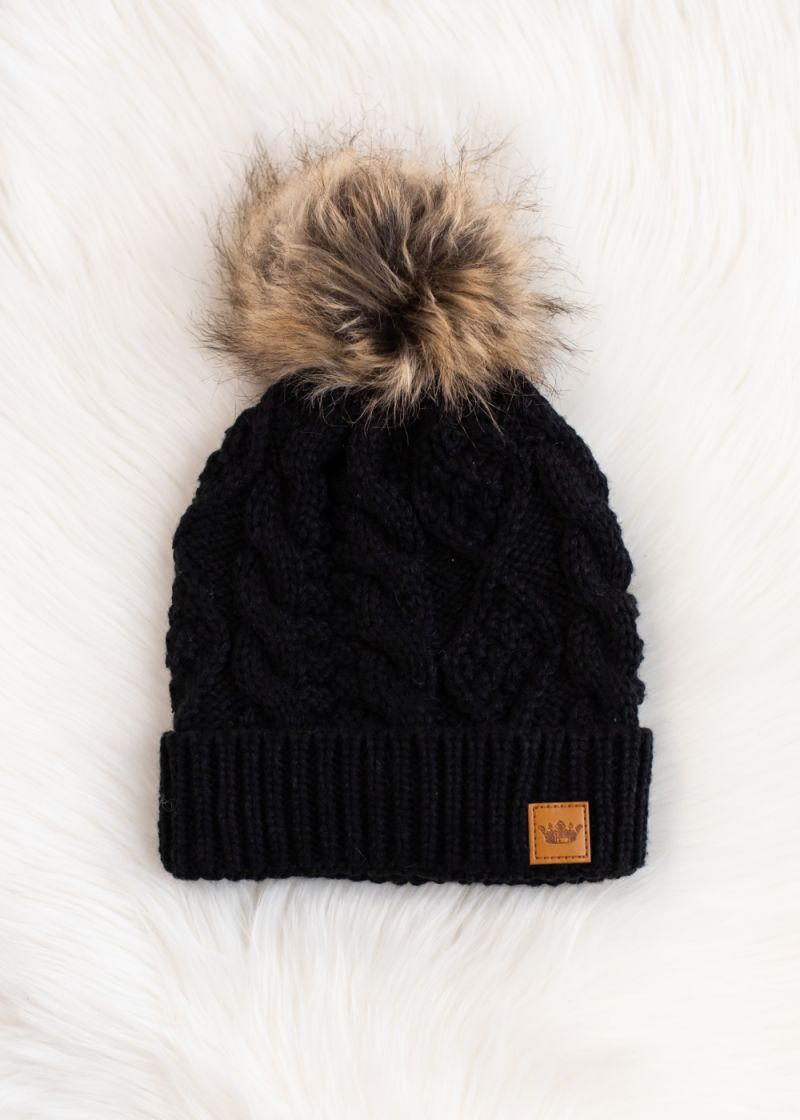 Classic, cozy, and effortlessly stylish. This black cable knit hat is topped with a natural faux fur pom for a playful finish, while the fleece lining keeps your head and ears warm on chilly days. Perfect for everyday wear, snowy walks, or coffee runs, it’s a timeless winter essential you’ll reach for again and again.