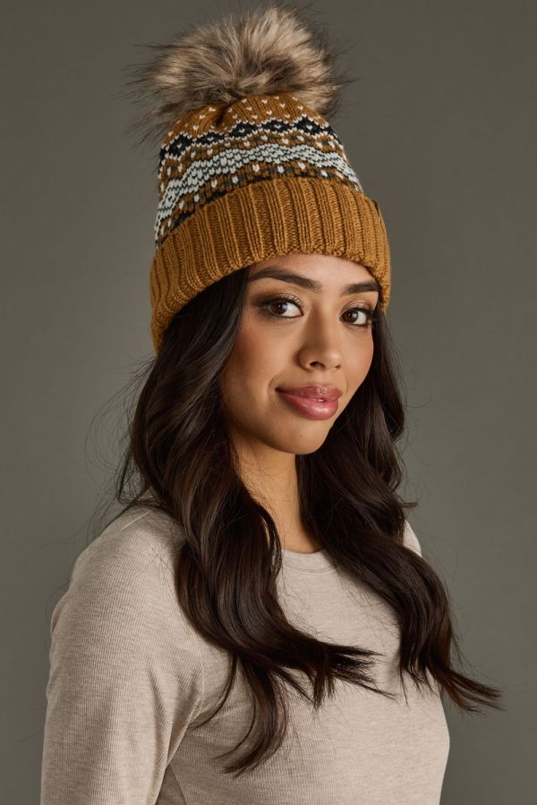 Add cozy style to chilly days with this camel, black, white, and blue patterned knit hat. The natural faux fur pom gives a playful finishing touch, while the fleece lining keeps your head and ears warm and comfortable. Perfect for everyday winter wear, snowy walks, or coffee runs, it’s a cheerful way to brighten up your cold-weather outfits.