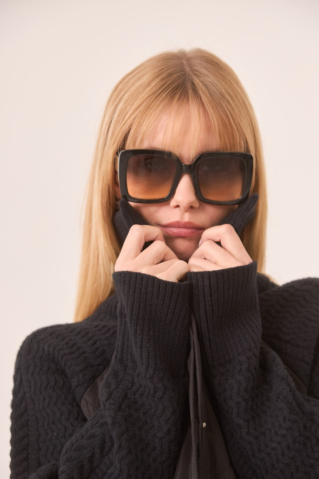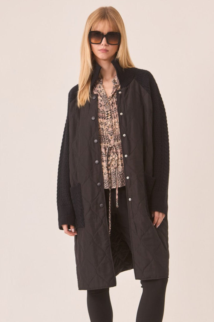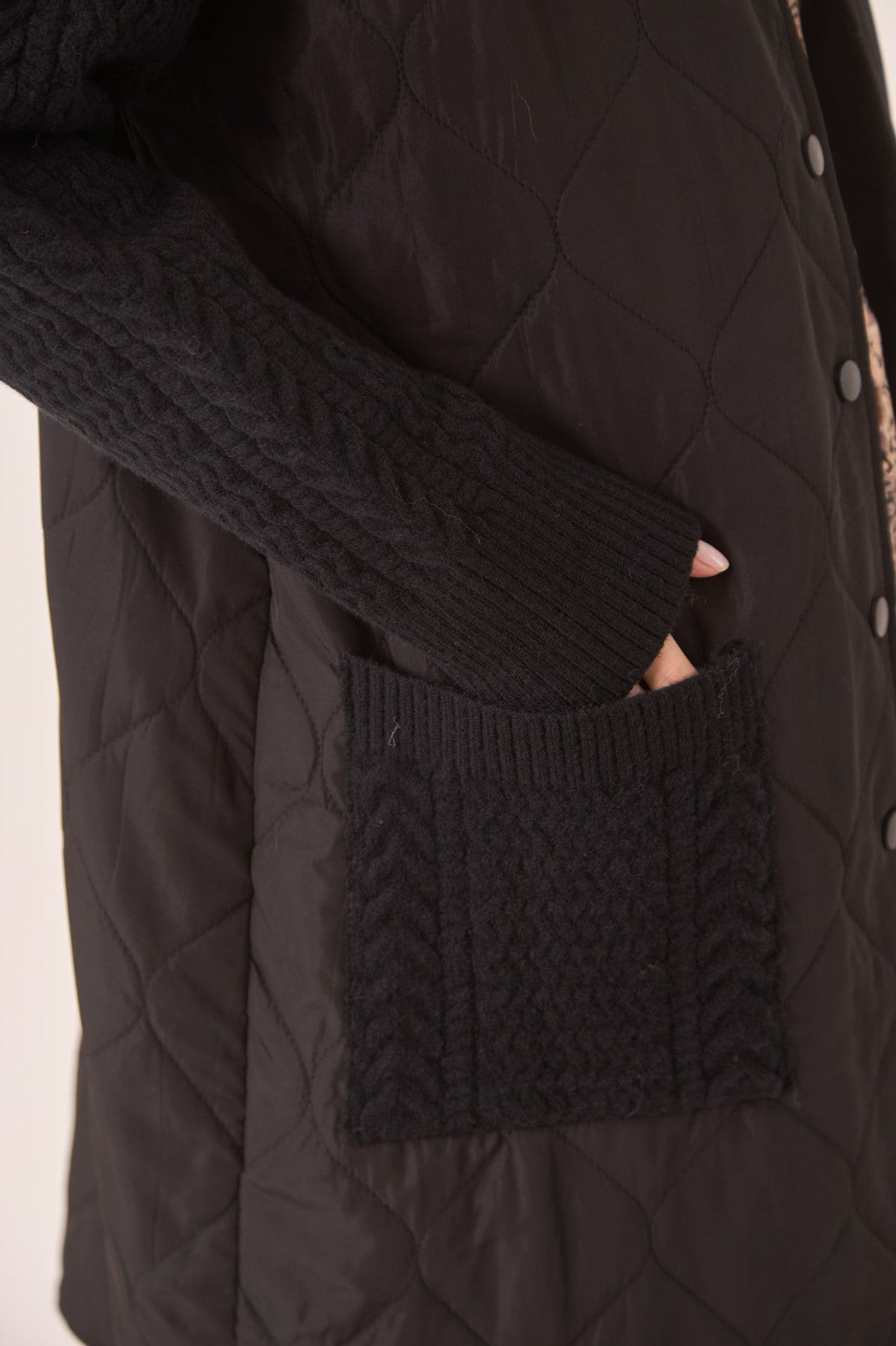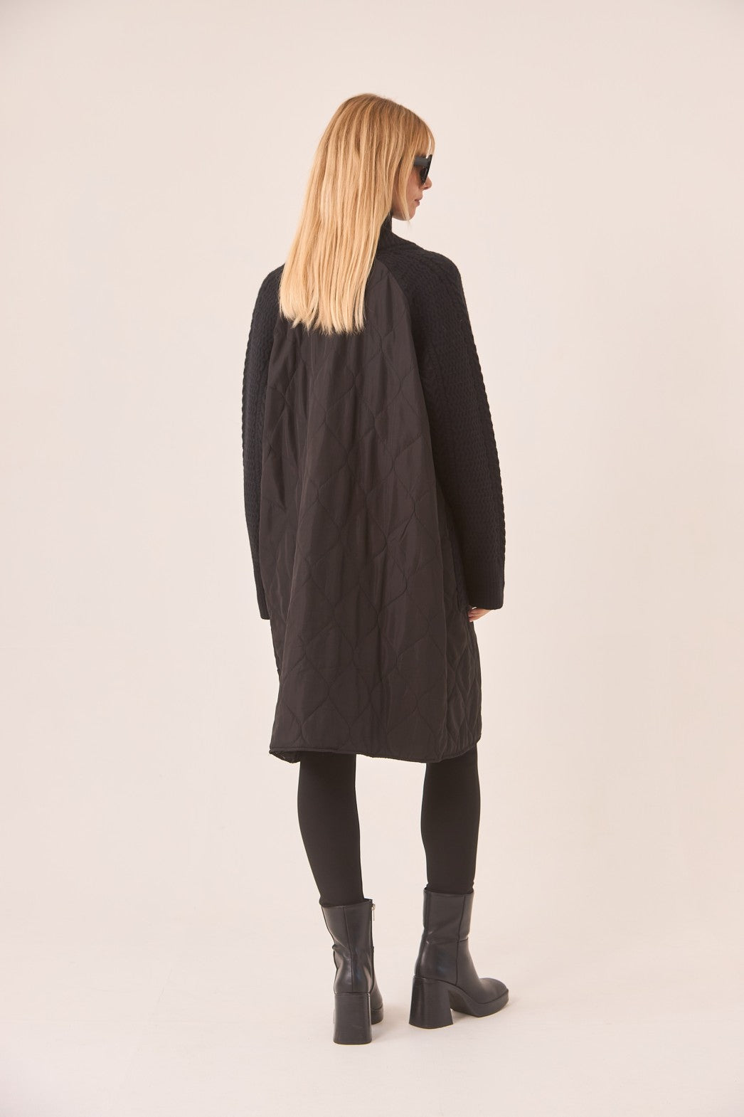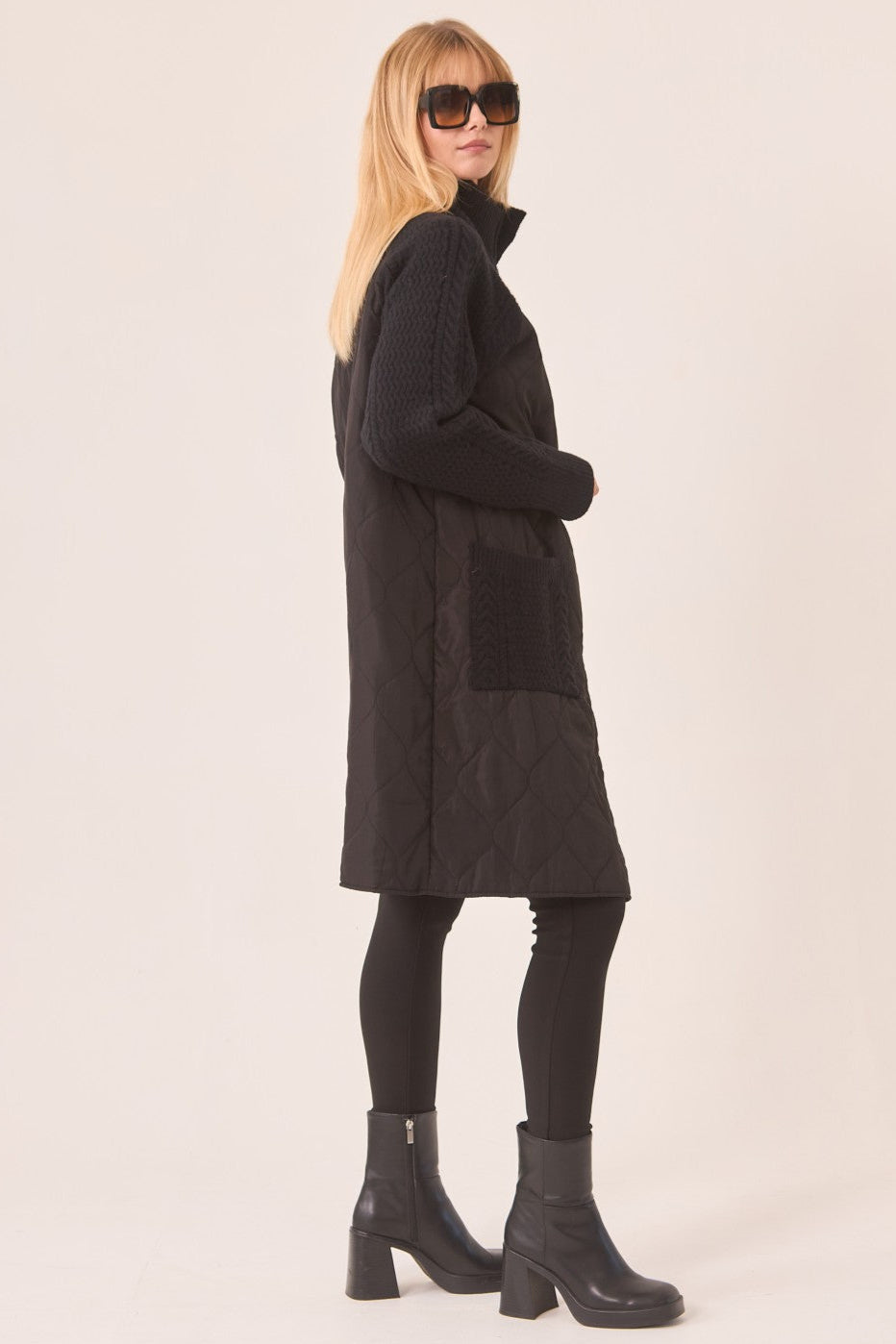 Stay warm in style with this black padded coat, featuring a playful mix of textures for a modern, boutique-ready look. The 3/4-length design is complemented by soft knit sleeves, collar, and pockets, adding extra comfort and cozy charm. A snap-button closure ensures an easy, adjustable fit, making it perfect for layering over dresses, jeans, or your favorite knits. This versatile coat blends practicality with a touch of luxe texture for an effortlessly stylish everyday statement.