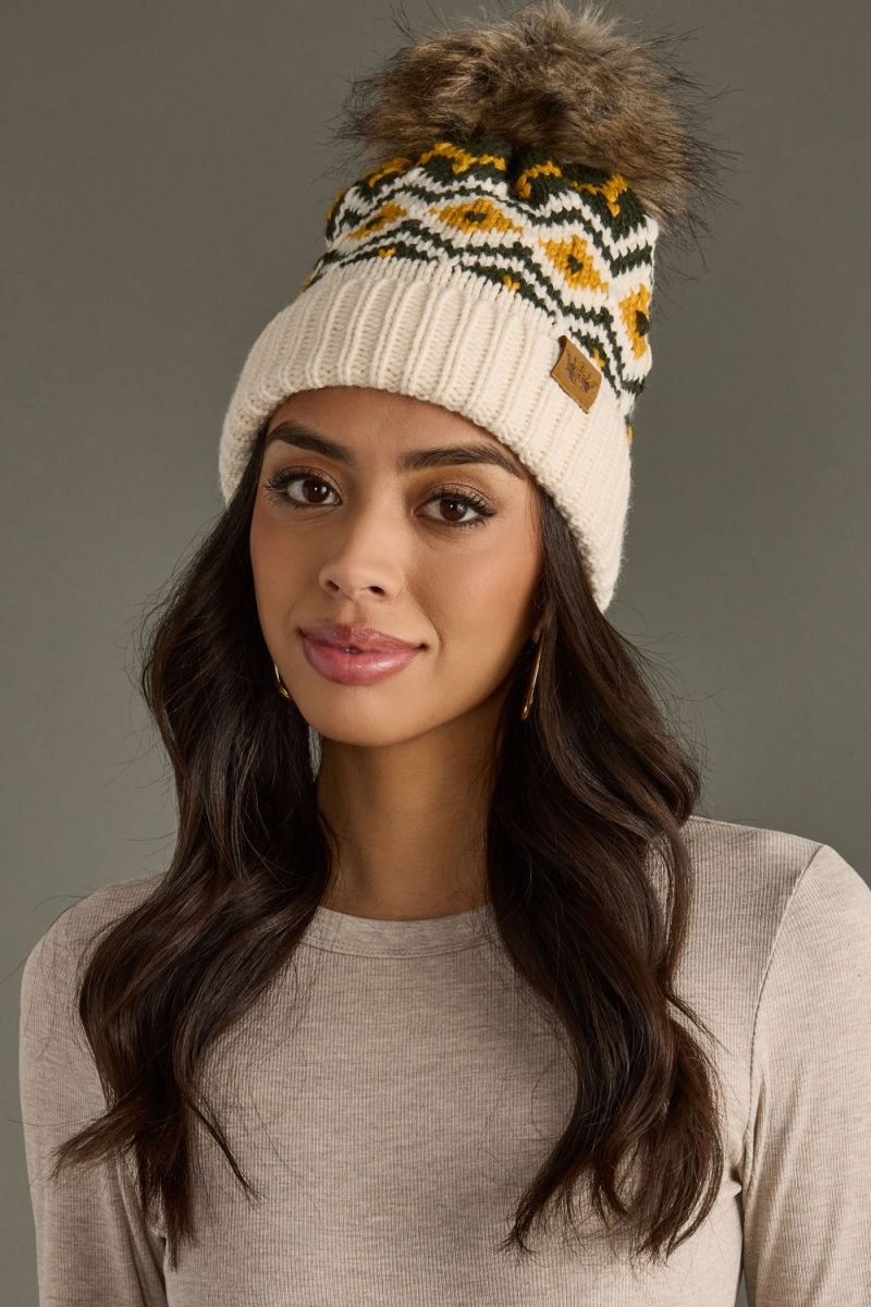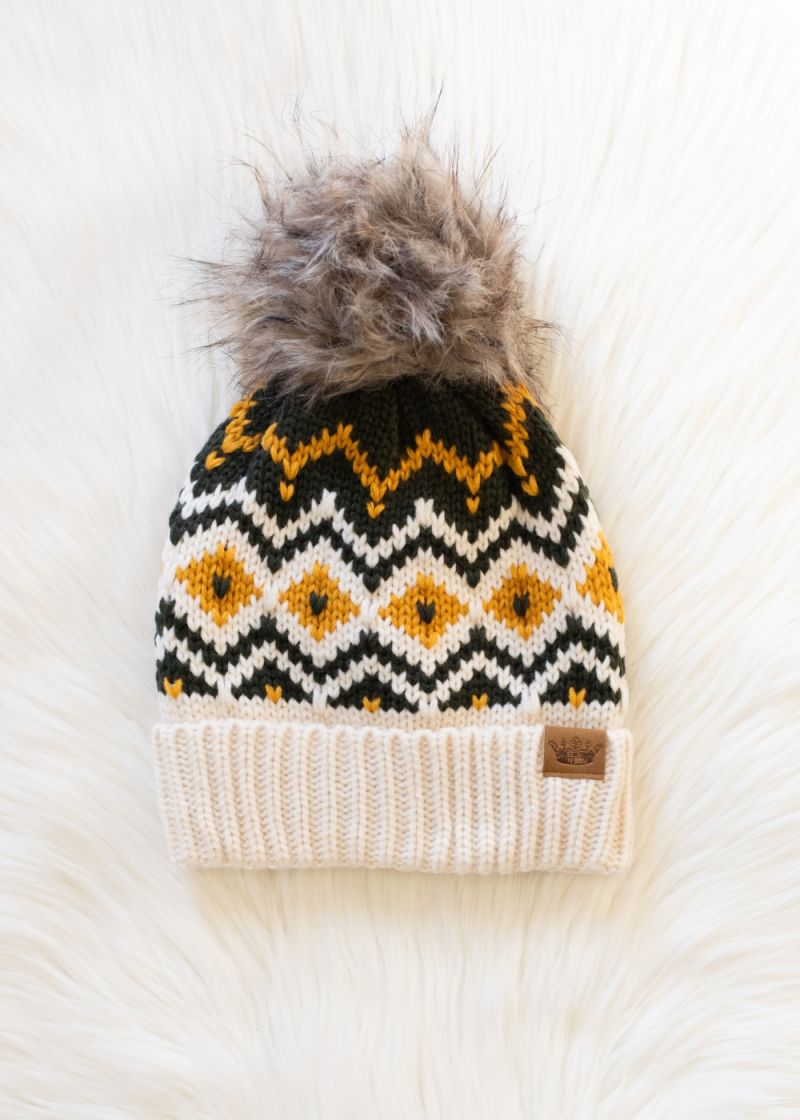Add a pop of color to chilly days with this cream, olive, and mustard patterned knit hat. The natural faux fur pom adds a playful touch, while the fleece lining keeps your head and ears snug and warm. Perfect for walks, coffee runs, or everyday winter wear, it’s a cheerful accessory to brighten any cold-weather outfit.