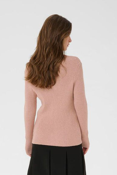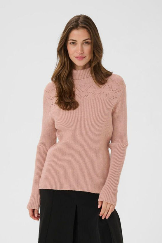 The Dela Rollneck Pullover in Mahogany Rose Melange is the knit you’ll reach for again and again. Its slim fit and ribbed texture give just the right amount of cozy structure, while the high rollneck keeps things snug and chic. The openwork yoke detail adds a playful twist, making this sweater more than your everyday basic. Finished with long sleeves and a hip-length cut, it’s perfect for tucking into jeans, pairing with skirts, or layering under your favorite jacket.