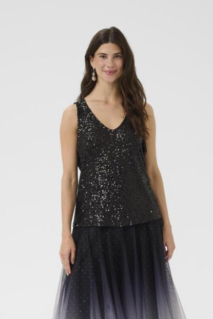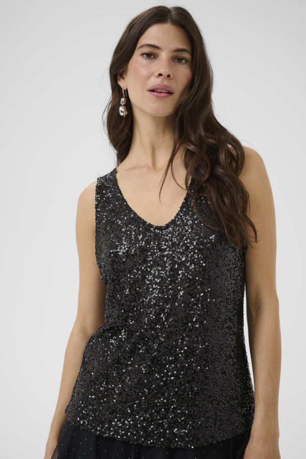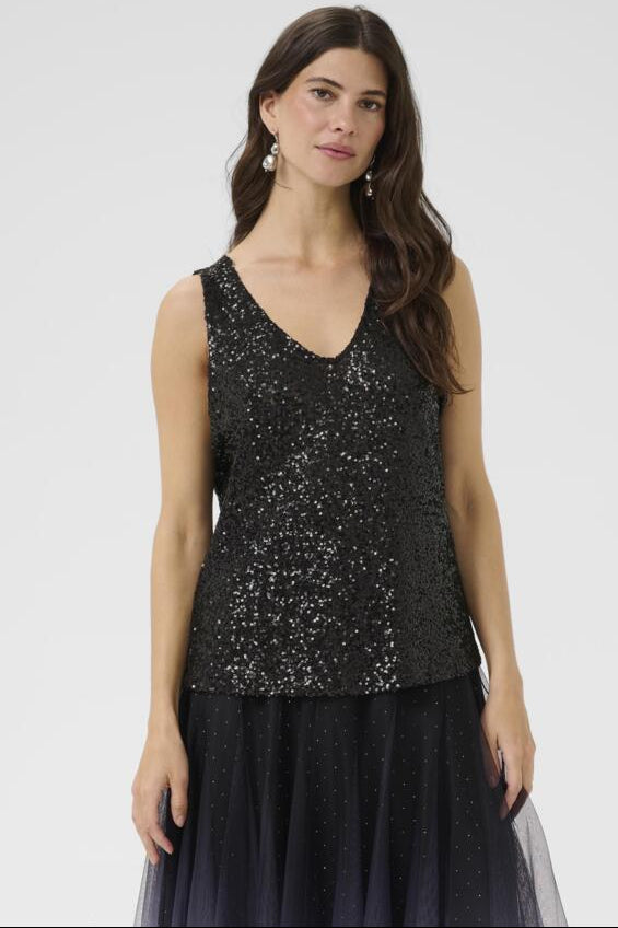 Shine bright in the Diddi Sequin Top – Black! With its relaxed fit, sleeveless cut, and flirty V-neckline, this sparkly favorite adds a fun touch to any evening look. Easy to style and comfy to wear, it’s your go-to for turning heads and feeling fabulous all night long.