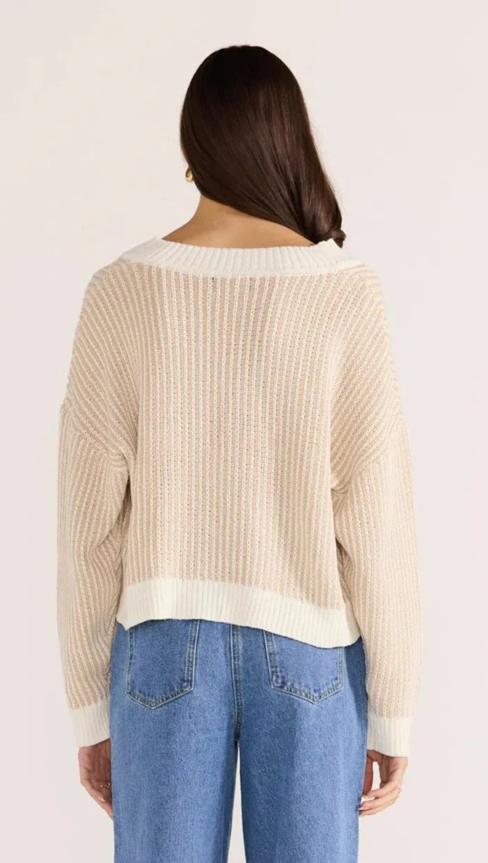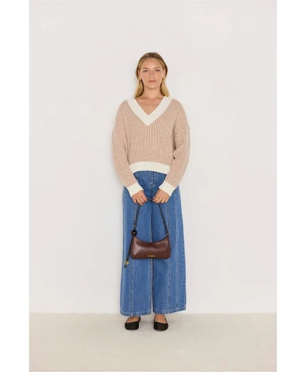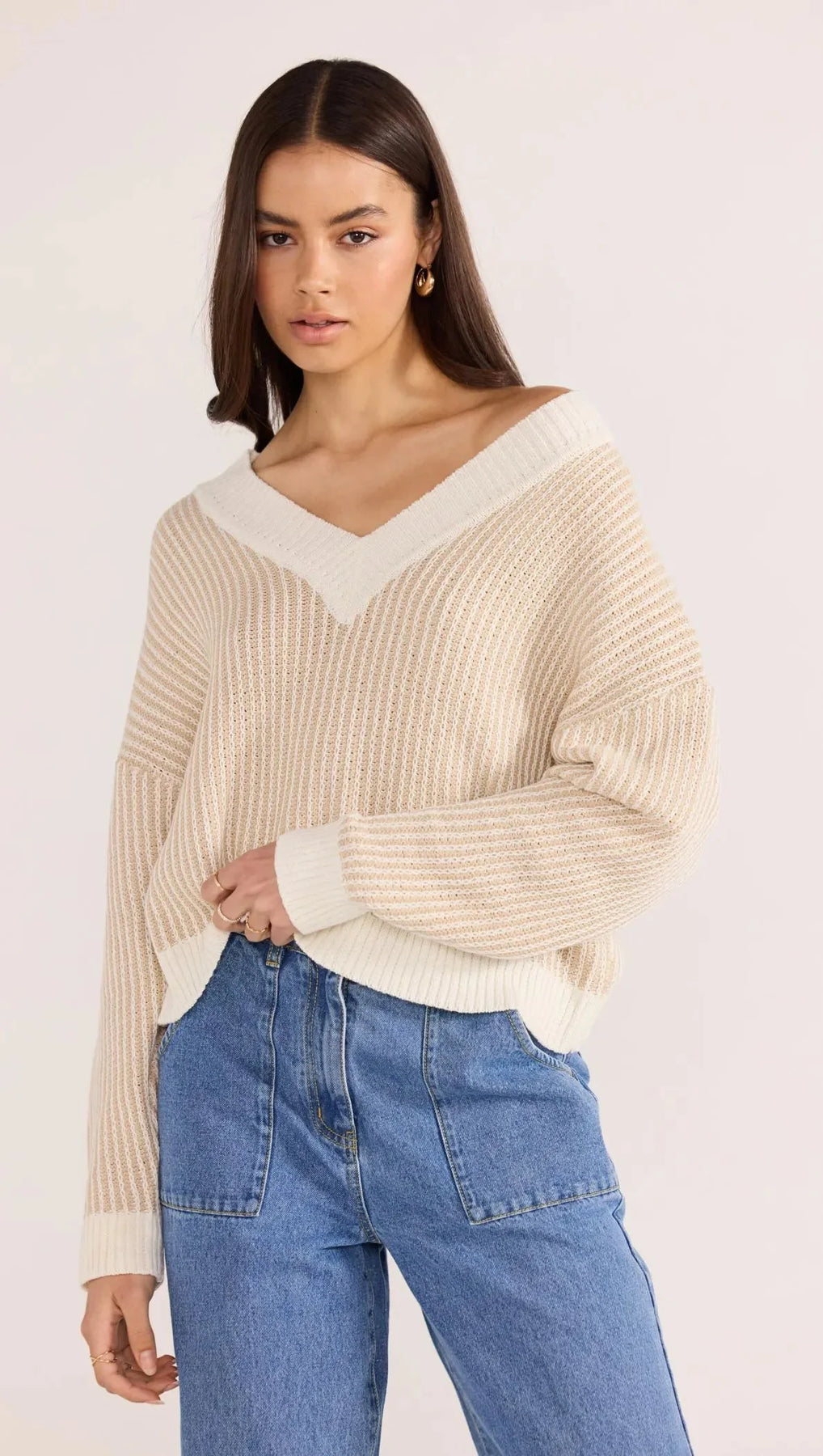 Elsie V-Neck Knit Sweater - Taupe/Cream