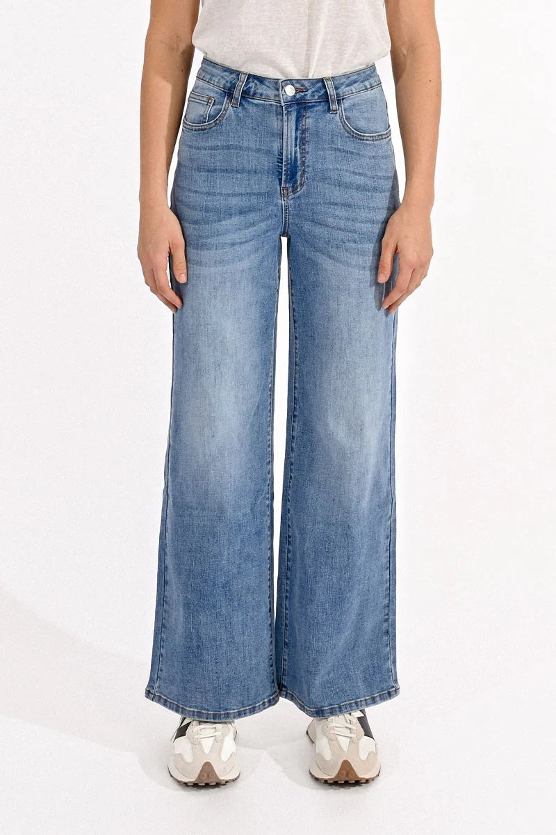 Step into effortless style with these wide-leg jeans designed for comfort and flair. Featuring a high waist that flatters every figure, these jeans come with side pockets at the front and patch pockets at the back for a practical yet stylish touch. The zip fly with a contrasting button closure adds a chic detail at the center front, while the light wash on the thighs and sides gives a subtle, lived-in look. Perfect for pairing with sneakers or boots, these jeans bring relaxed, everyday style with a polished twist.