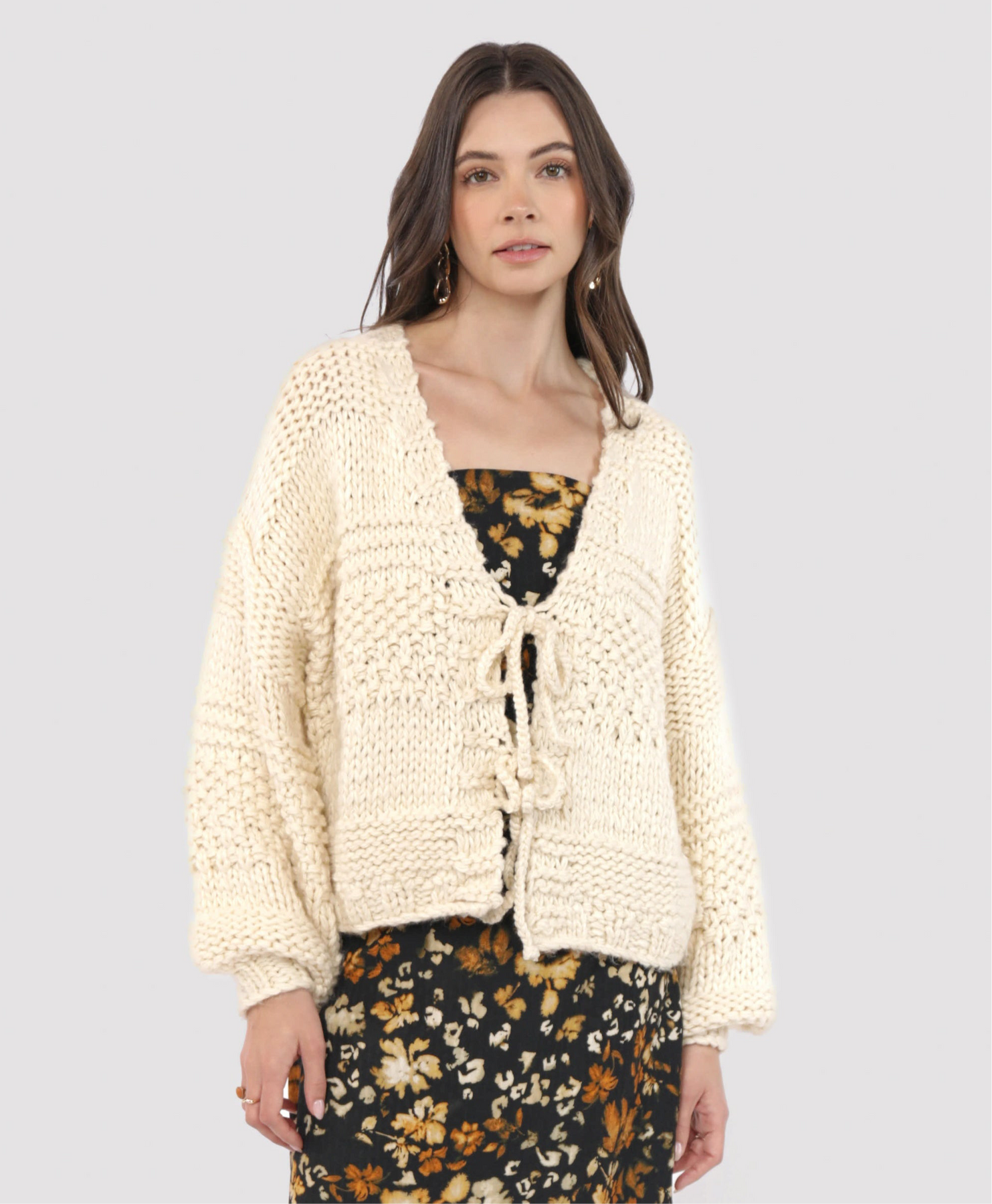 Cozy up in the Iggy Chunky Tie Front Hand Knit Cardigan—your new favorite oversized sweater for crisp fall days. Its soft ivory knit and playful tie front add a touch of charm, while the chunky texture keeps you warm and snug during your autumn adventures. Perfect for layering and showing off those delicate details we adore!