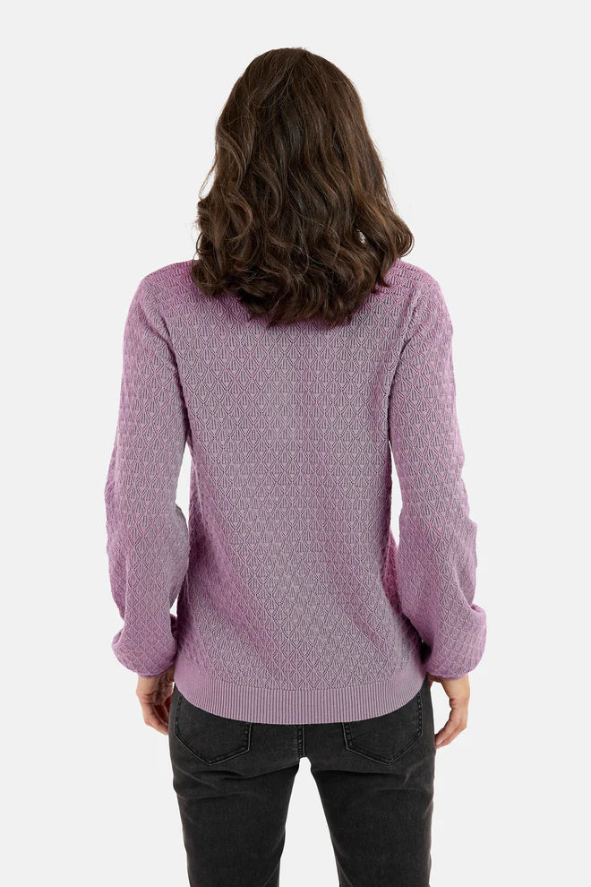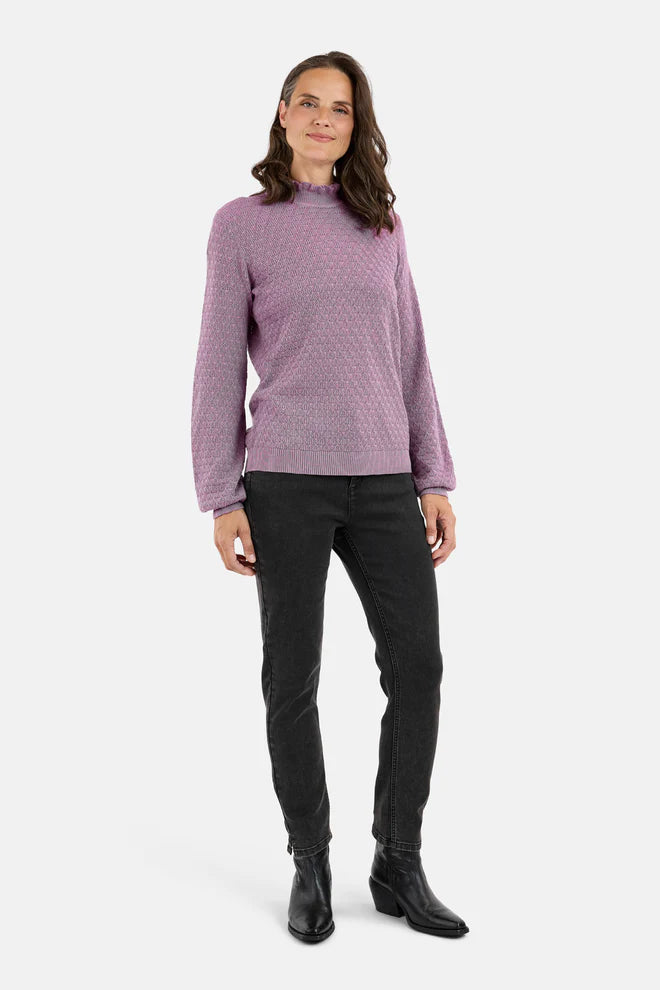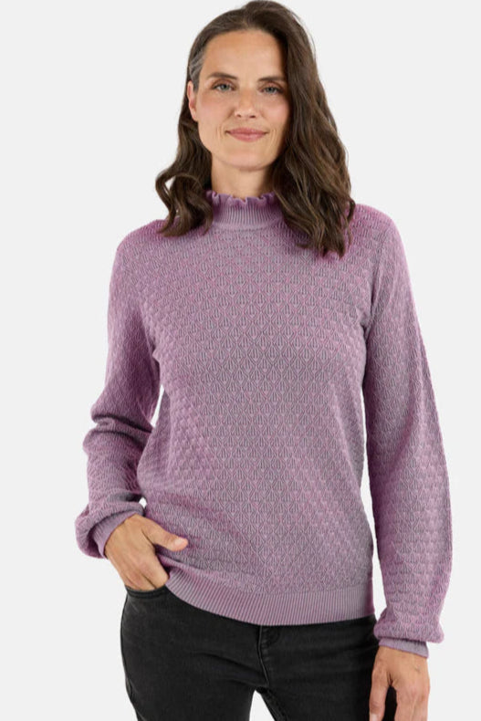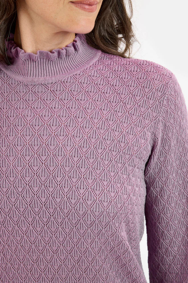 This lavender knit sweater combines elegance and comfort with its fine textured knit and delicate ruffle details at the neck. The model has long sleeves and a high neck, which gives a classic and feminine look. The soft viscose blend makes the blouse comfortable to wear all day long.