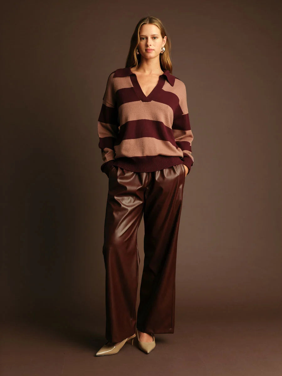 Wrap yourself in cozy charm with the Nick Polo Sweater in Wine and Nougat. Featuring a flattering V-neck, this soft sweater blends rich, warm tones perfect for adding a splash of fun to your wardrobe. Whether layering up for chilly days or dressing up a casual outfit, it promises comfort with a playful twist.
