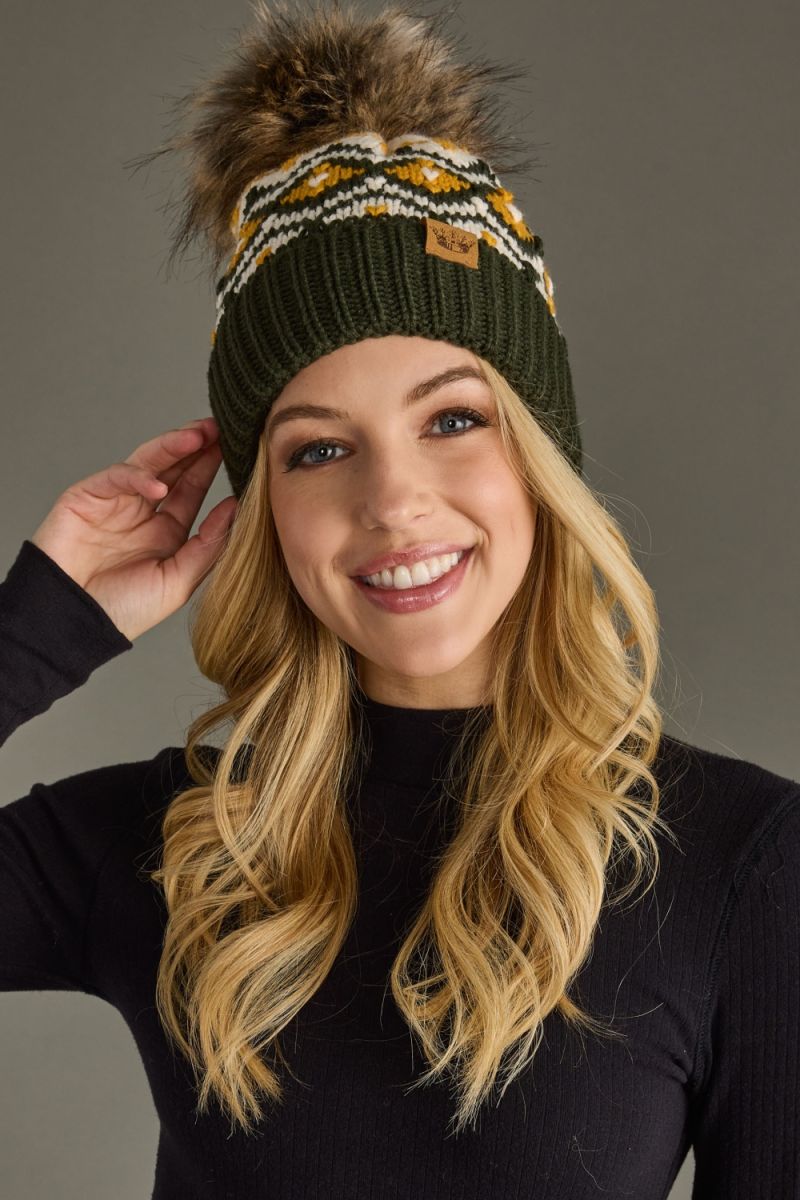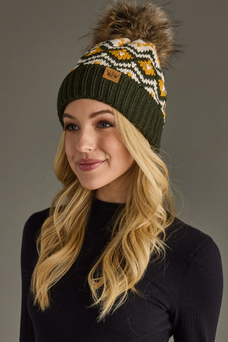 Bring a touch of warmth and color to chilly days with this olive, cream, and mustard patterned knit hat. The natural faux fur pom adds playful charm, while the fleece lining keeps your head and ears cozy and snug. Perfect for walks, errands, or any cold-weather adventure, it’s an easy way to brighten up your winter wardrobe.
