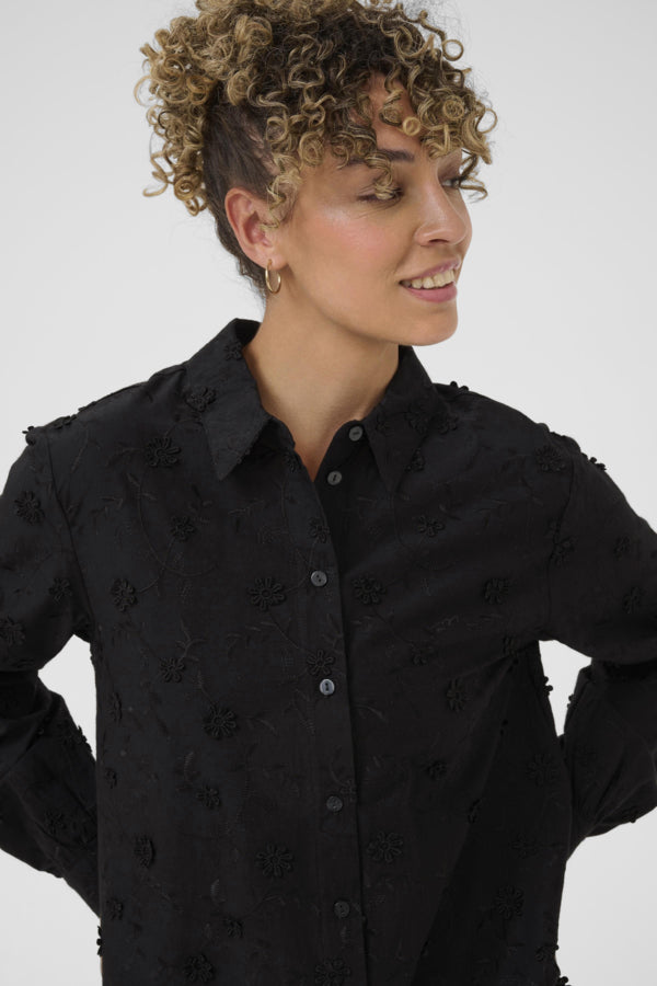 Introducing the Olivia Shirt in Black—your new go-to for effortless style! This relaxed-fit beauty features a timeless collar and full-length sleeves that work just as hard as you do. The real magic? Subtle 3D embroidery that adds unexpected texture and visual interest to an otherwise classic silhouette. With a convenient button-front closure and versatile design, it's equally at home in the office or paired with your favorite jeans for weekend adventures. Comfort meets refined detail in one seriously wearable piece.