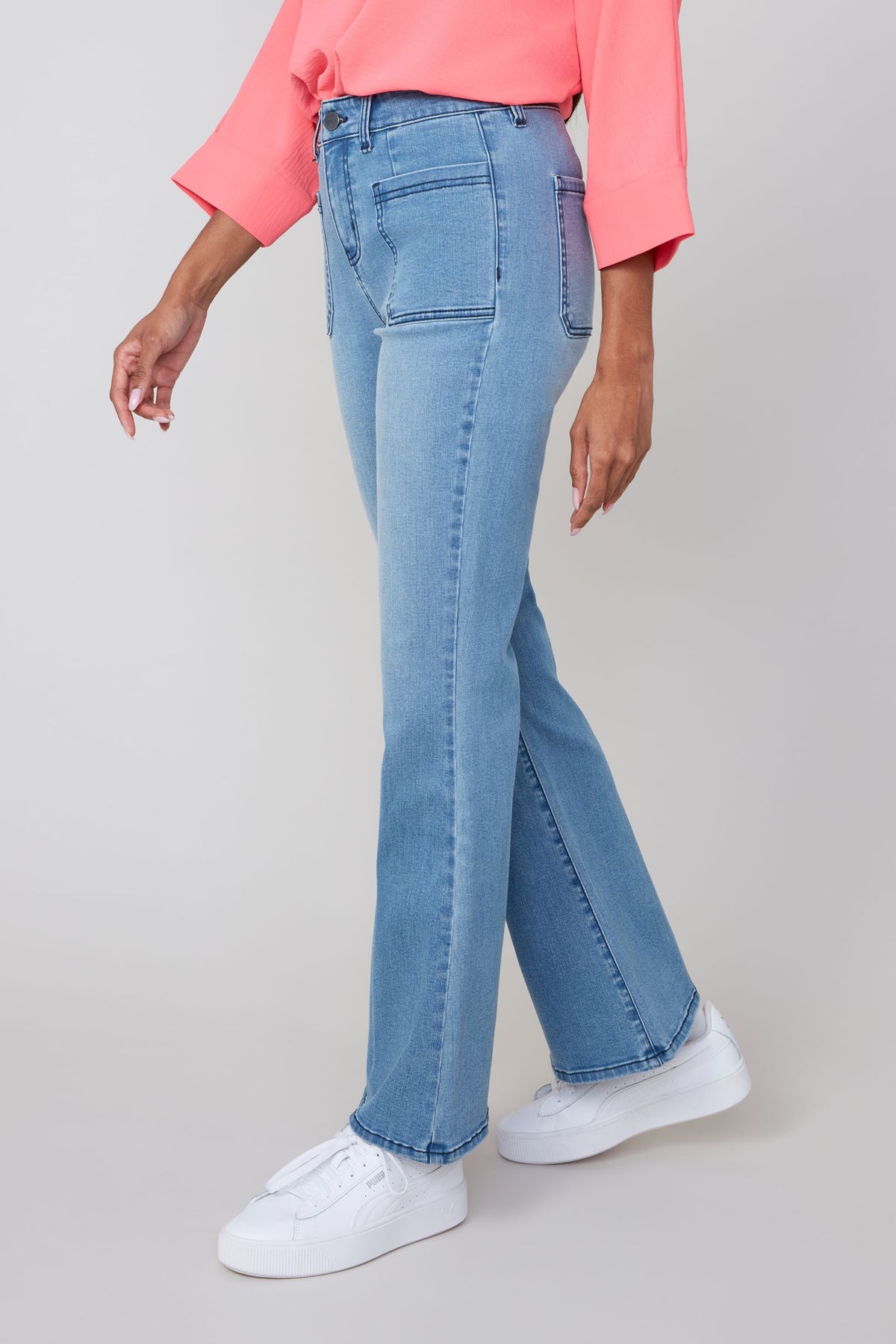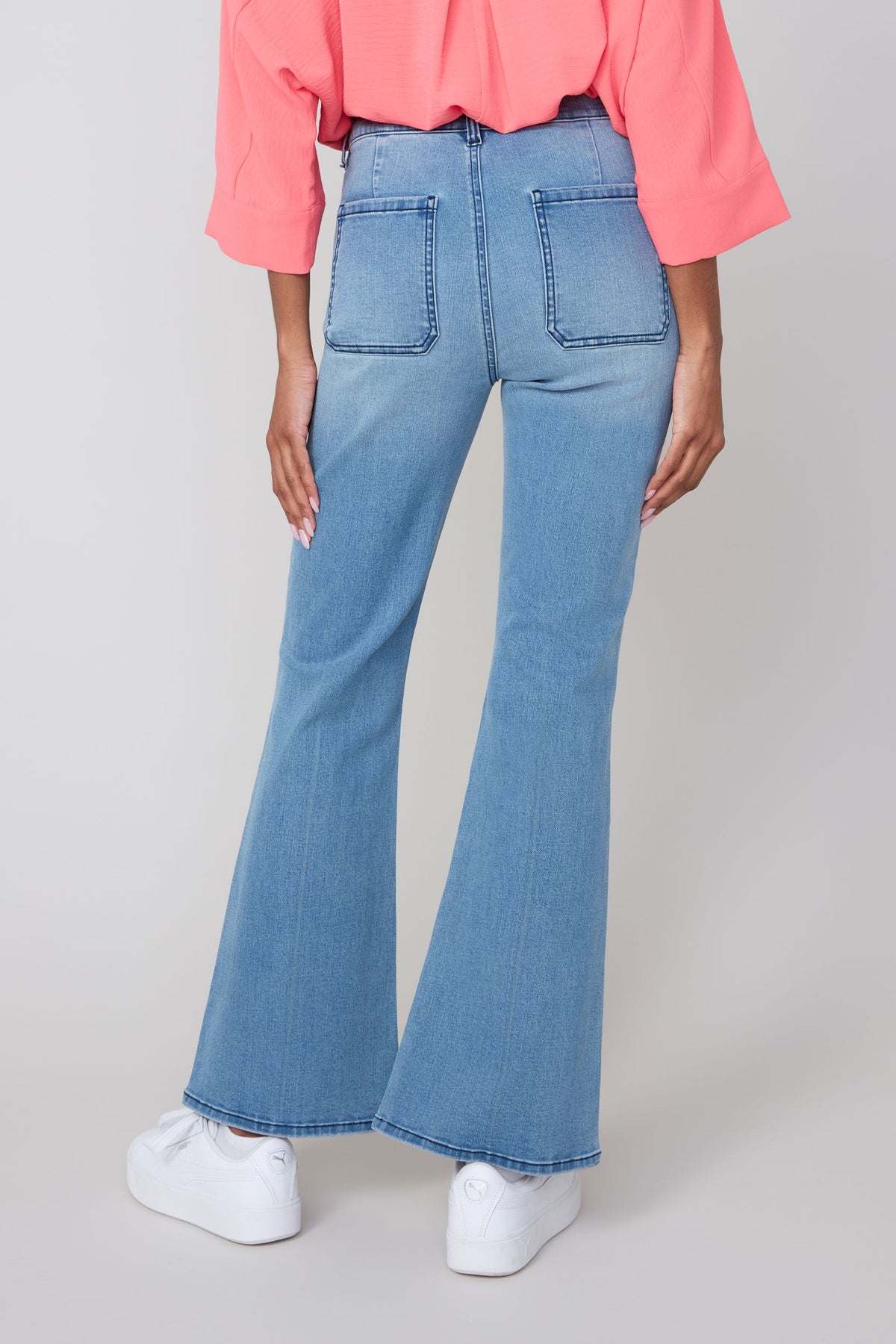 Bring a touch of retro charm to your denim lineup with the Patch Pocket Flare Jeans in a classic blue wash. The front patch pockets add vintage-inspired character, while the flattering flare leg elongates your silhouette for an effortlessly cool look.
