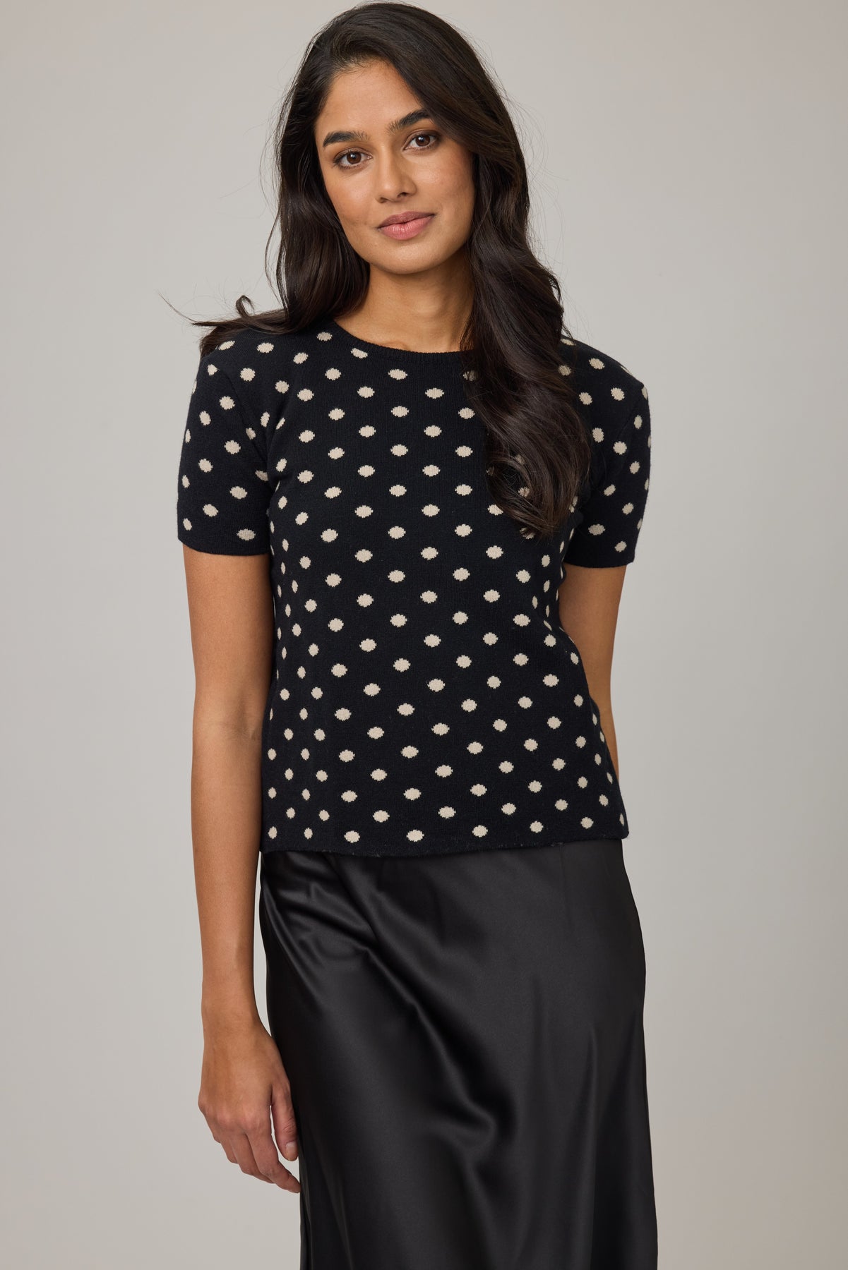 Add a little fun to your wardrobe with this playful polka dot knit sweater. Featuring a soft black base sprinkled with cheerful beige polka dots, it’s the perfect mix of cozy and cute. The short sleeves make it an easy piece to wear year-round — pair it with jeans for casual days, tuck it into a skirt for a chic touch, or layer it under your favorite jacket when it’s cooler. A timeless print with a modern twist, this sweater is one you’ll keep reaching for.