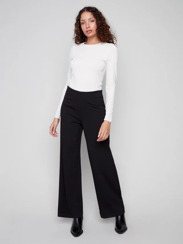 Elevate your wardrobe with these chic black wide-leg pants that combine sophistication and comfort. Featuring a pull-on design, a flattering mid-rise, and an elastic waistband, they offer a perfect fit every time. The expertly blended fabric drapes beautifully while providing flexibility, making them ideal for both the office and relaxed outings. Effortlessly enhance your style with this versatile fall essential.