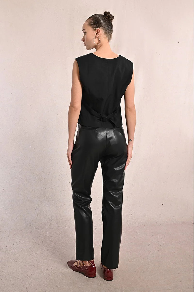 Bring bold energy to your look with this cropped faux leather vest—perfect for holiday wear. Its sleek V-neckline, wide front darts, and chic welt pockets create a polished silhouette, while the cropped cut makes it easy to style with everything from high-rise trousers to flowy skirts. The covered button closure keeps things refined, giving you just the right mix of edgy and festive. Whether layered over a blouse or worn solo with statement jewelry, this vest is made for turning holiday outfits into unforgettable looks.