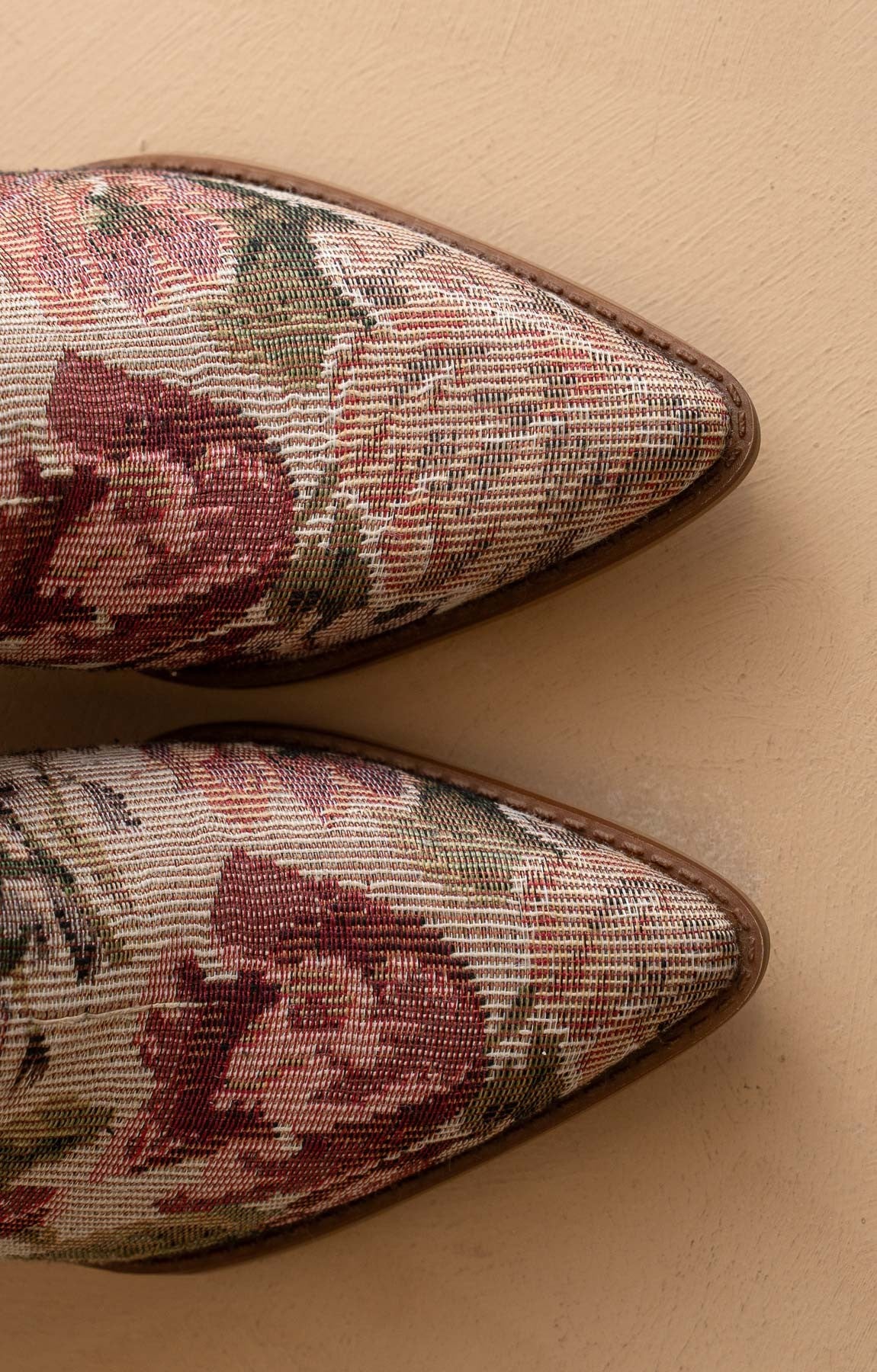 A vintage-inspired western moment, reimagined in our iconic tapestry material-instantly recognizable and beloved for its intricate texture and luxe finish. The Karina features a romantic mauve floral palette, available for a limited time only. Finished with a sculpted mid-height heel, pointed toe, and our signature DreamCloud cushioned sole, this collector's edition bootie blends statement style with everyday comfort.