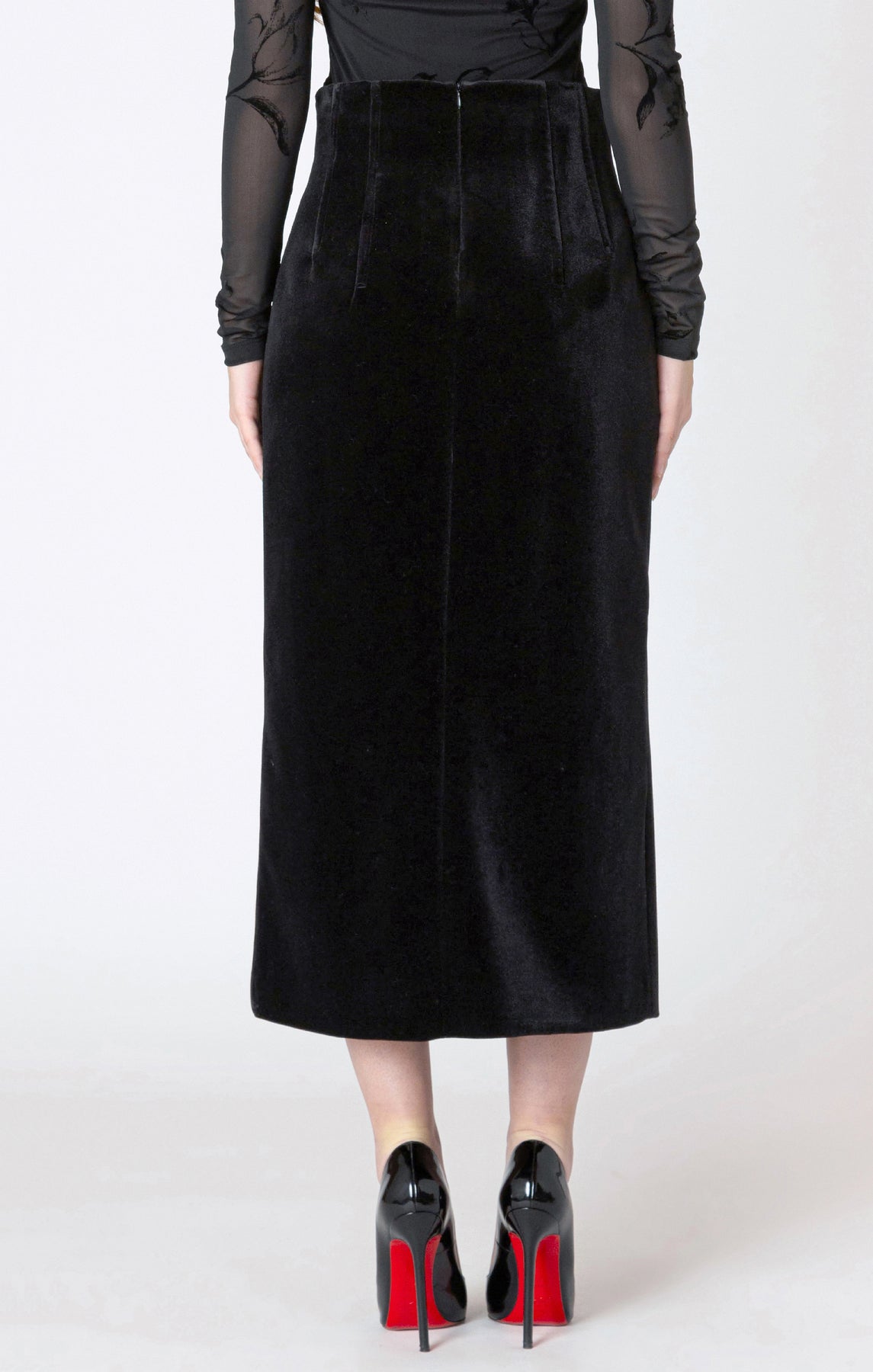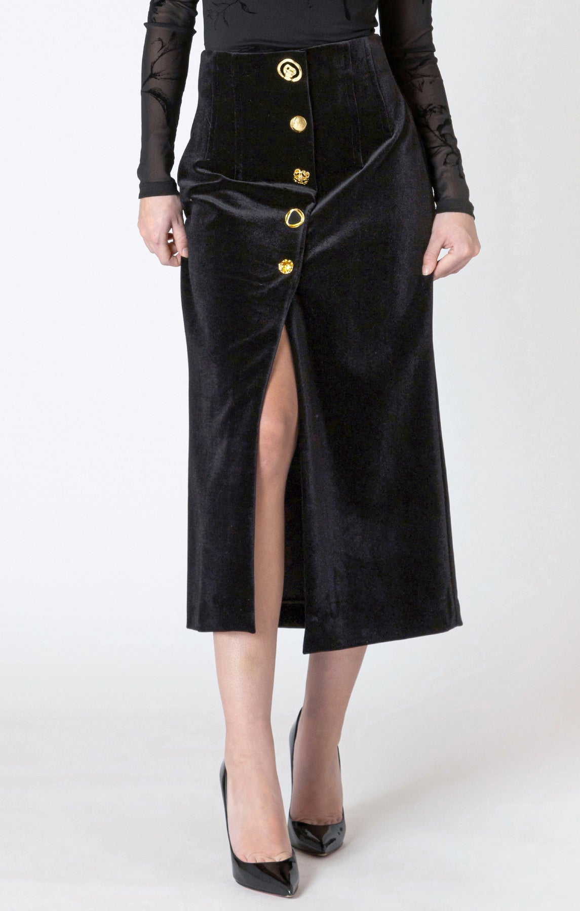 This velvet skirt shines with five charming buttons along the front, adding a touch of playful detail to your outfit. A sleek back zipper ensures easy wear while maintaining a smooth silhouette. Perfect for twirling through your day in style and comfort!