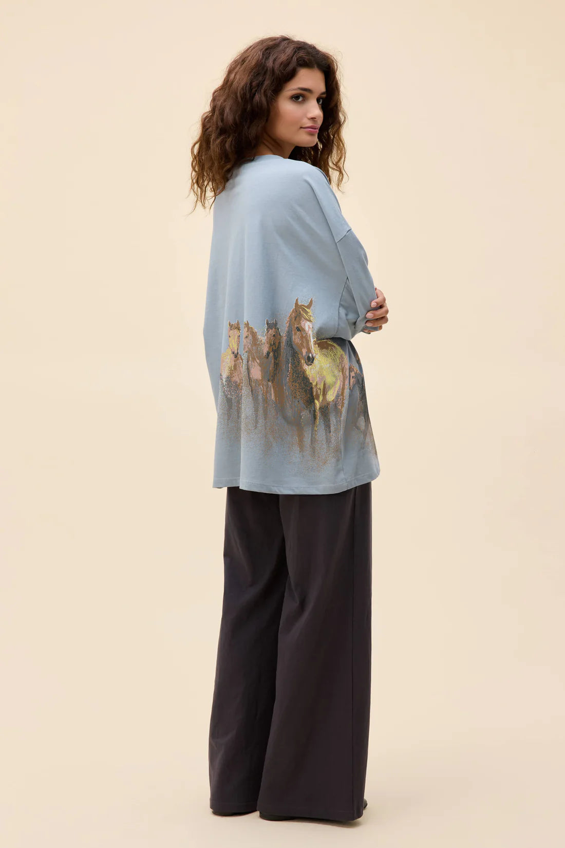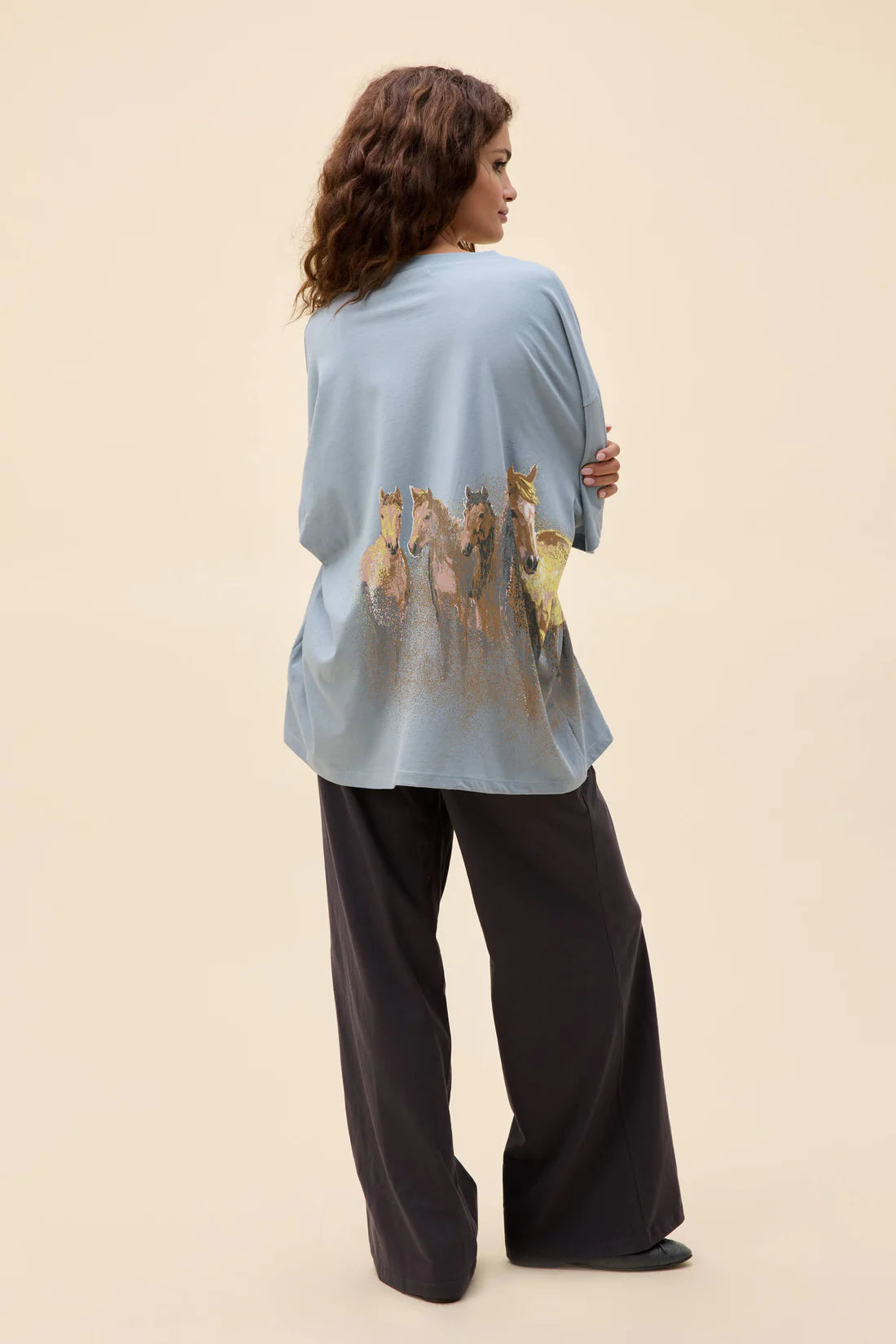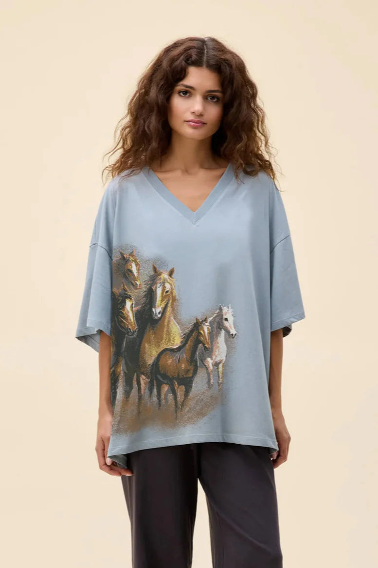 Loosen the reins. Wild horses run across the chest wrapping to the backside of this OS V-Neck. Designed on our best-selling body and most oversized fit, now offered with a v-neckline.