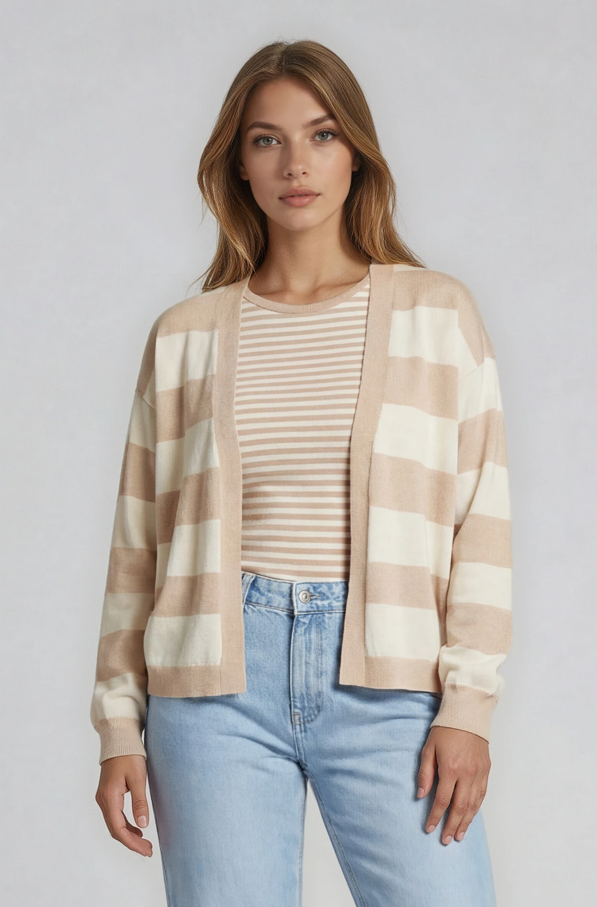 Layer up in style with this charming long sleeve striped cardigan featuring a classic tan and cream palette. Perfect for those "just right" temperature moments, this versatile piece transitions seamlessly from casual coffee runs to cozy evenings at home. The timeless stripe pattern adds visual interest without overwhelming your outfit, while the relaxed fit ensures comfort all day long. Throw it over your favorite tee, dress, or sweater for an effortless, put-together look that works year-round.