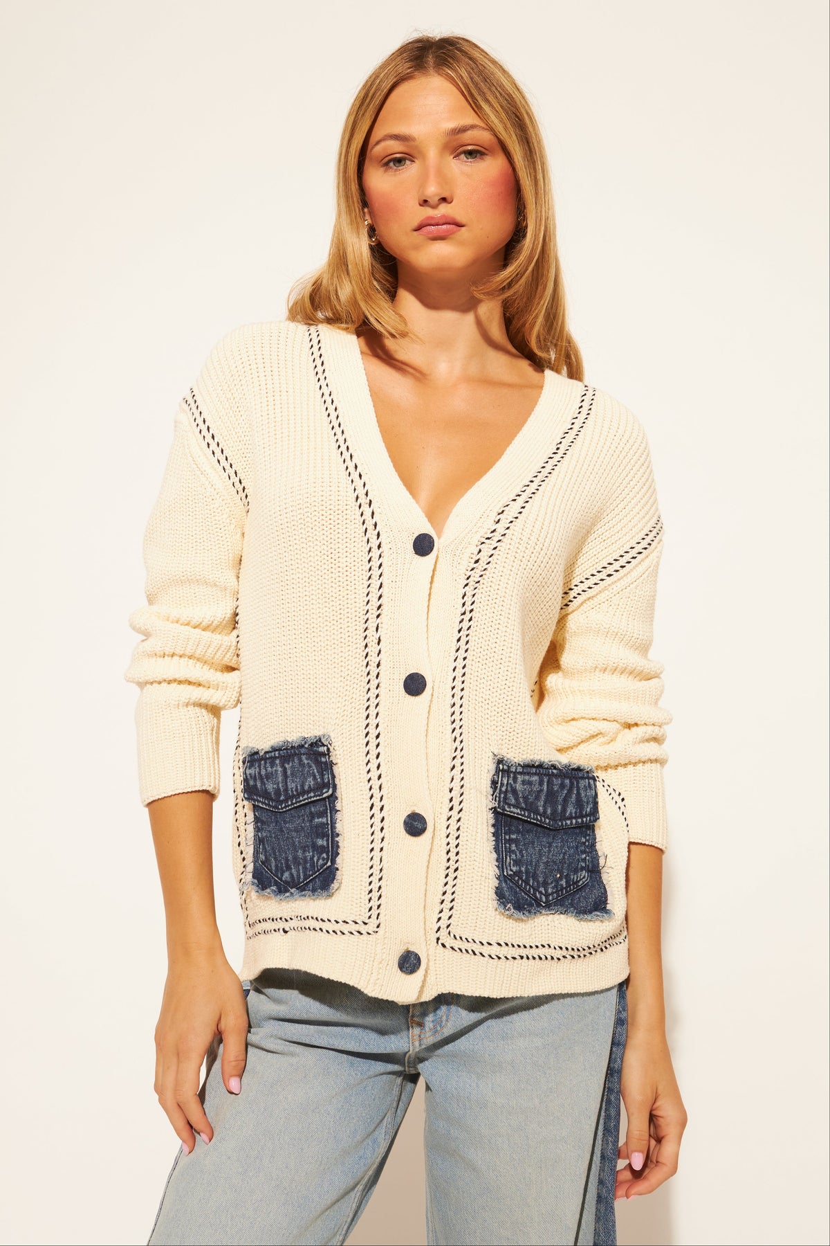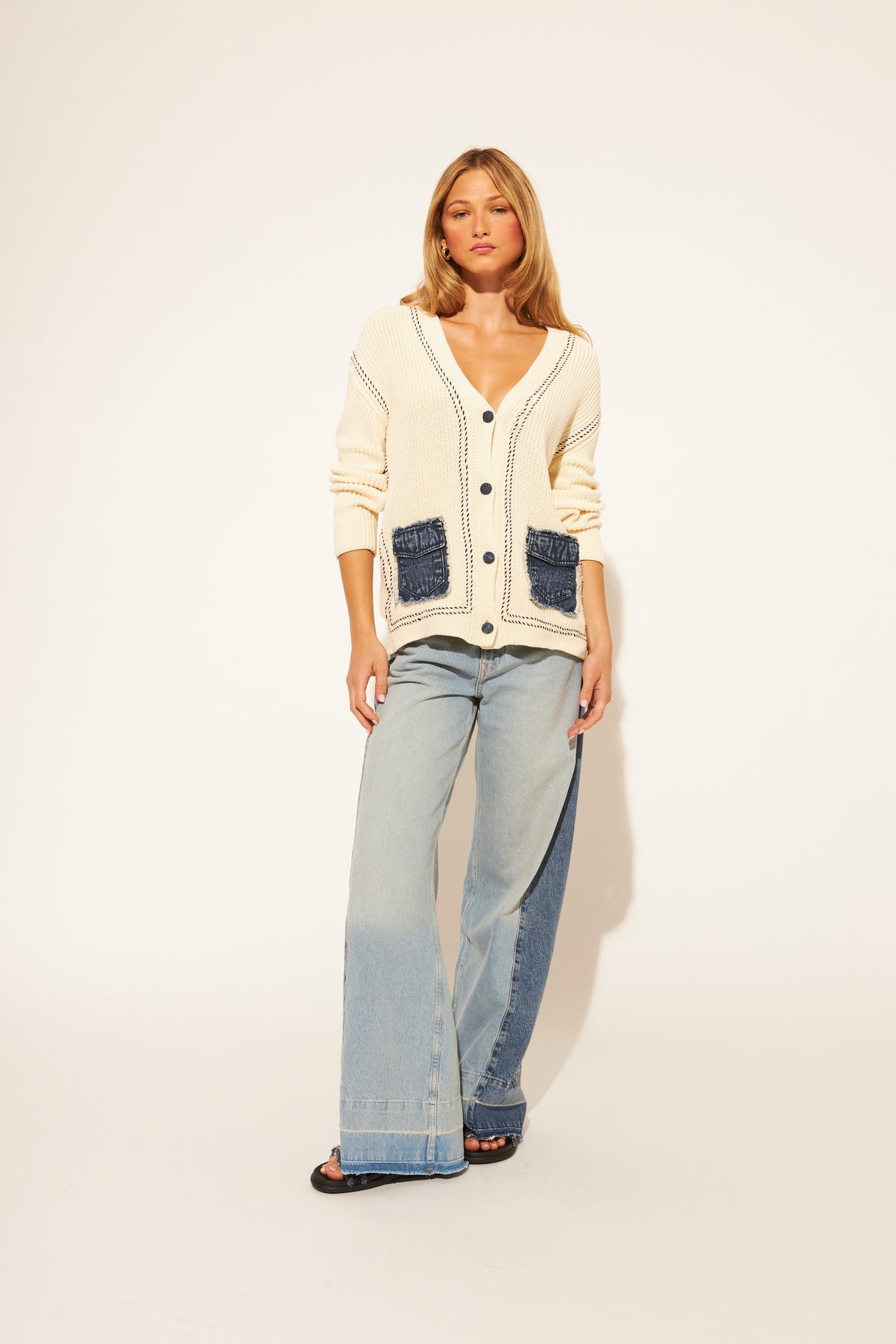 This 100% cotton cardigan blends classic comfort with unique detailing. The luxurious cream base is complemented by selvedge denim elbow patches and matching patch pockets, adding texture, visual interest, and practical storage. Perfect for layering over tees or blouses, it effortlessly balances relaxed ease with refined style. A versatile piece designed to become a seasonal staple in your wardrobe.