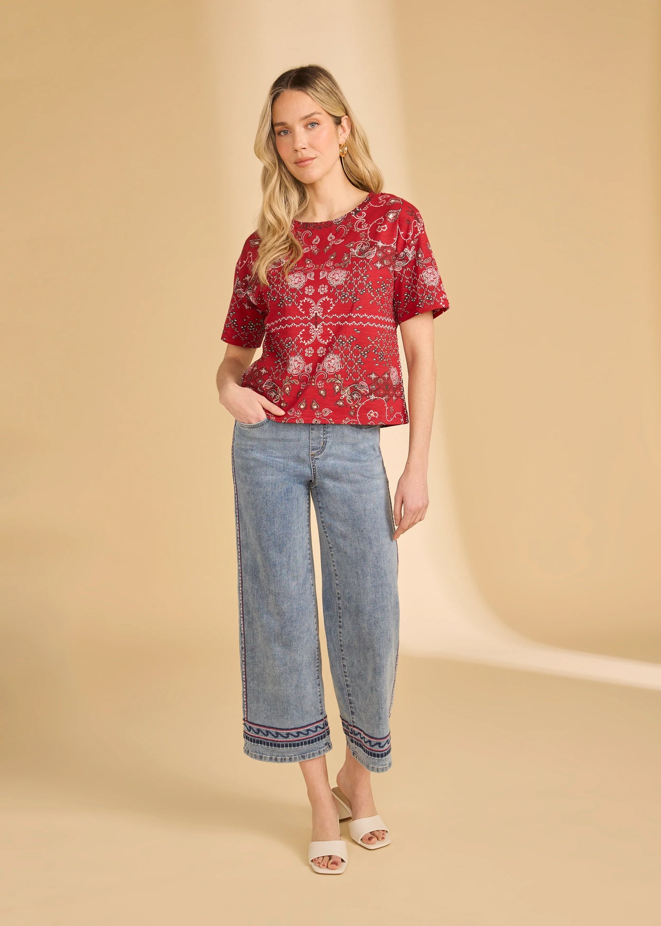 Discover the perfect blend of simplicity and uniqueness with our cotton-modal top, featuring a striking red Polynesian block print enhanced with a touch of foil for subtle sparkle. Its crew neck and set-in sleeves offer a comfortable fit, gliding over your body effortlessly without clinging. Perfect for both work and weekends, this top promises style and comfort in one. Don't miss out on this versatile must-have!