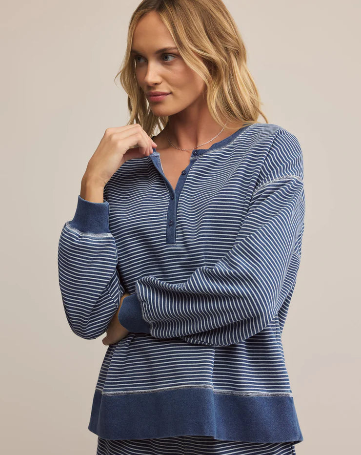 With classic thin stripes and contrasting cuffs, waistband, and neckband, this relaxed knit denim henley brings playful texture to everyday style. It's finished off with standout coverstitch detailing for a casual-cool look you can wear year-round.