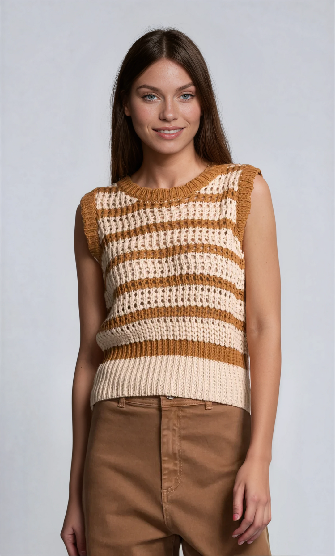 You'll totally adore the new sleeveless striped crochet sweater vest, which has an open-knit design and horizontal stripes. The knit pattern switches between bold, solid caramel brown stripes and finer, open-weave cream or beige stripes, showcasing distinct holes and lacework in the lighter areas. The neckline and armholes are finished with a solid, ribbed brown trim, while the bottom hem features a wide, solid ribbed band in the lighter shade.
