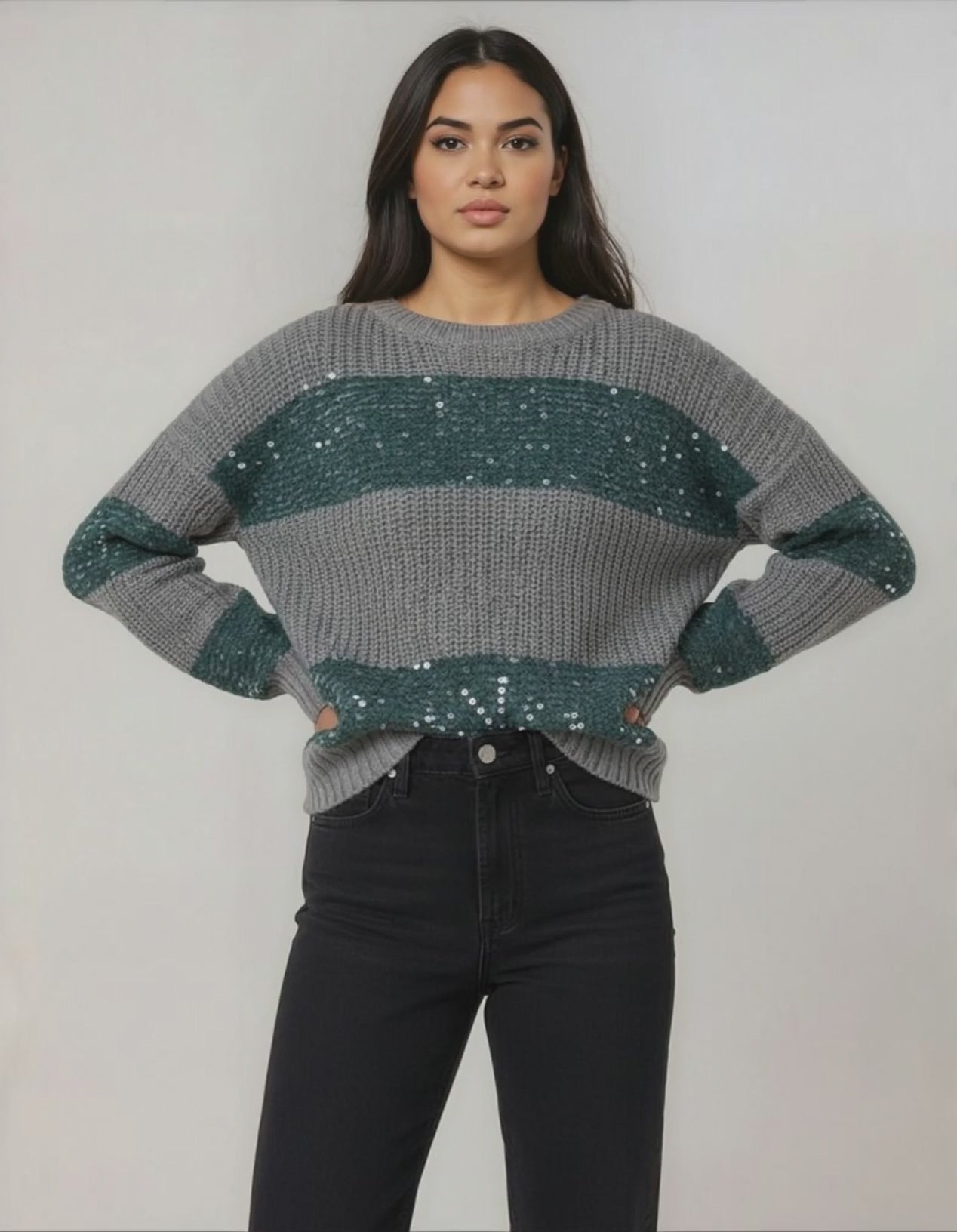 Bring sparkle and style to your everyday wardrobe with this teal crew neck sweater featuring bold, oversize stripes accented with subtle sequins. The soft knit keeps you cozy, while the eye-catching stripe design adds playful, boutique-ready charm. Perfect for pairing with jeans, skirts, or layering over dresses, this sweater adds a touch of fun and sophistication to every outfit.