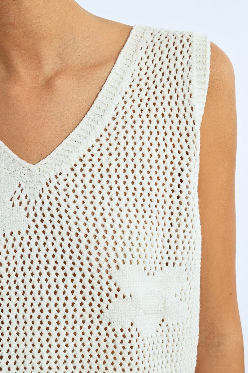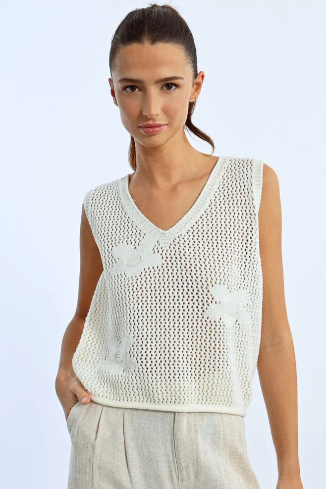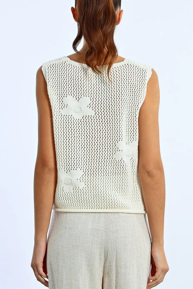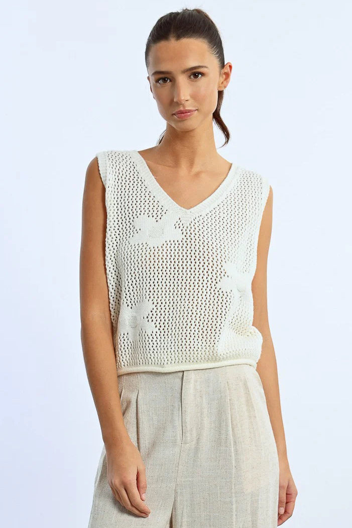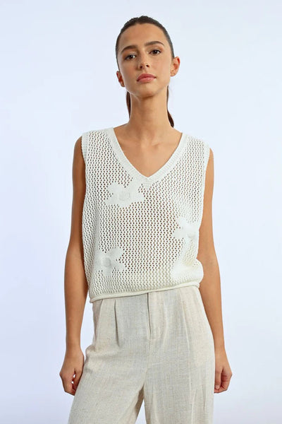 This one’s blooming with charm! Featuring an openwork crochet knit and a playful flower pattern, this sleeveless sweater adds instant personality to your look. The wide V-neckline gives it that easy, laid-back feel—perfect for layering over tanks, bralettes, or even dresses. Light, breezy, and totally unique… it’s the kind of piece that sparks compliments wherever it goes.