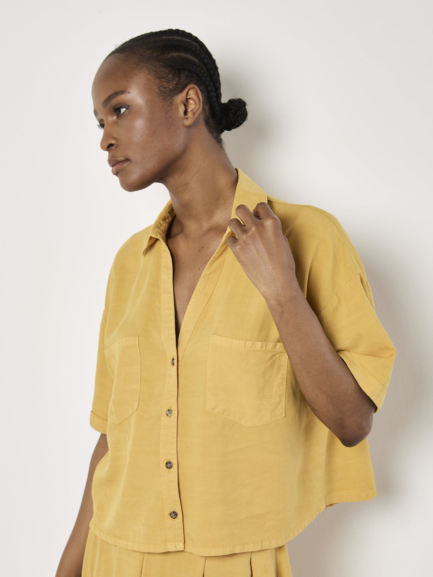 Open Collar Safari Cropped Slub Shirt - Mustard